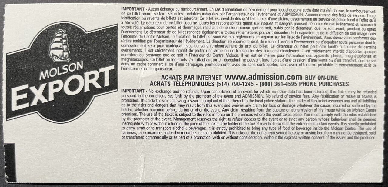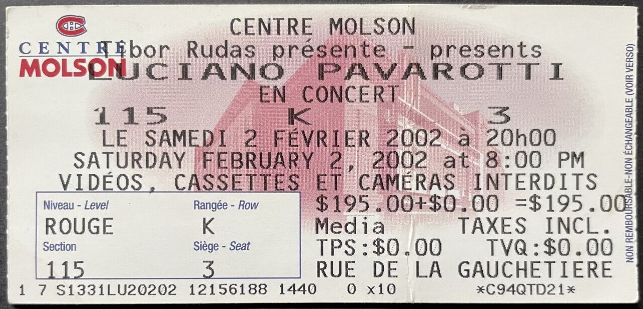 2002 Luciano Pavarotti Concert Ticket Montreal Molson Centre Vintage