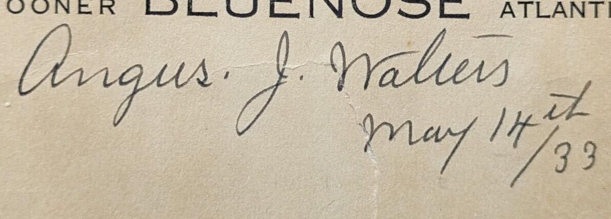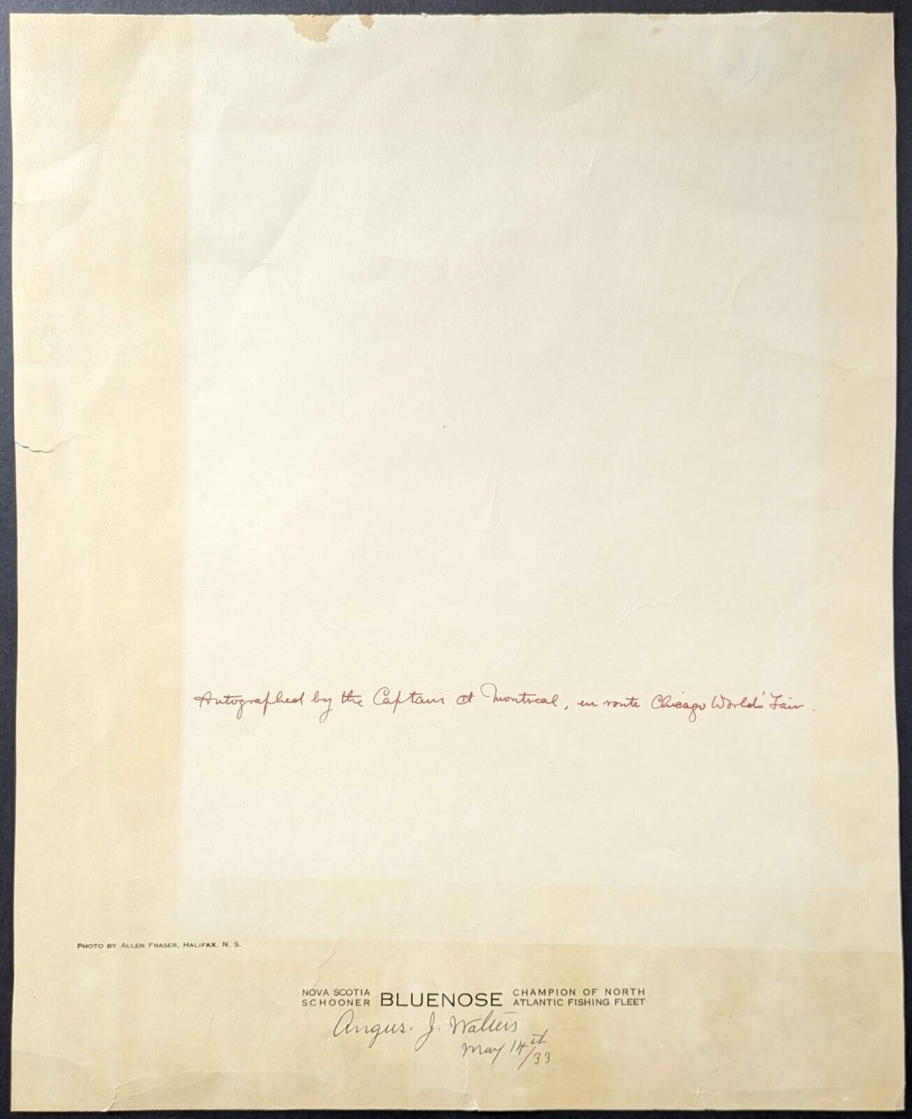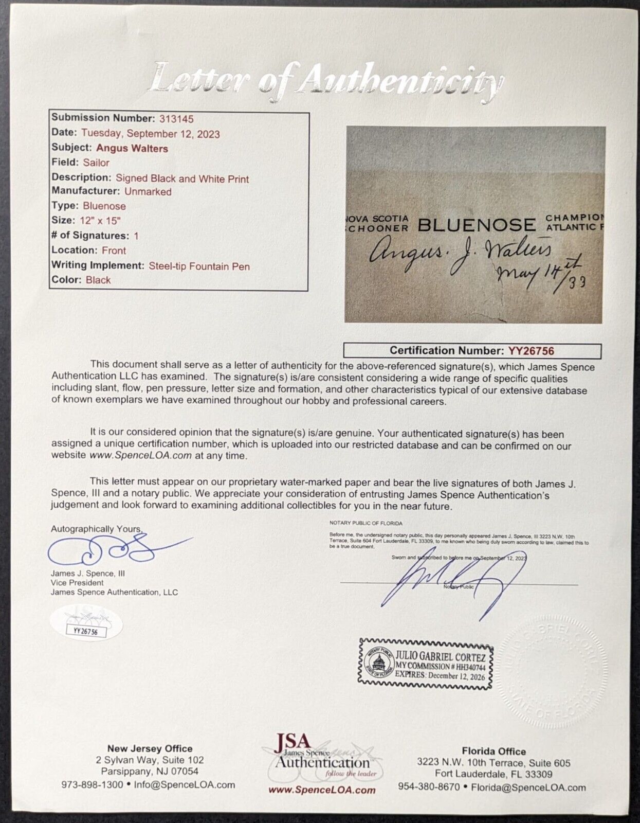 - 1933 Champion Sailing Schooner The Bluenose Print, signed by captain Angus Walters, authenticated by JSA