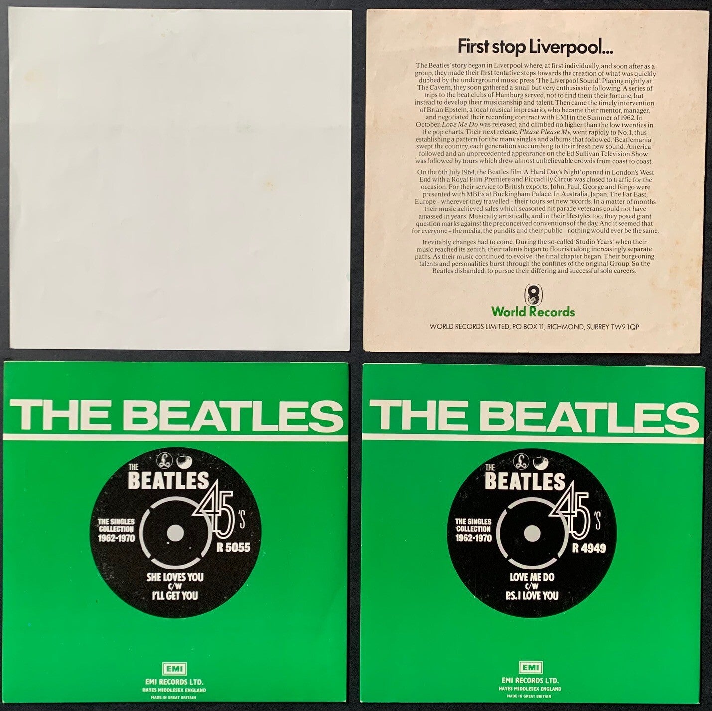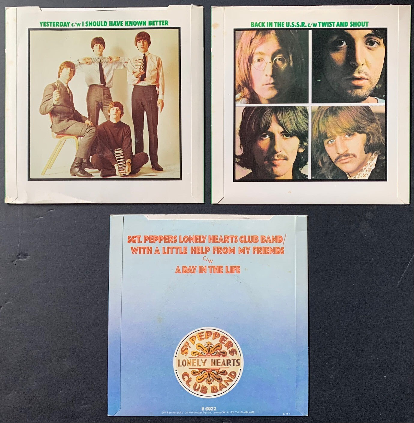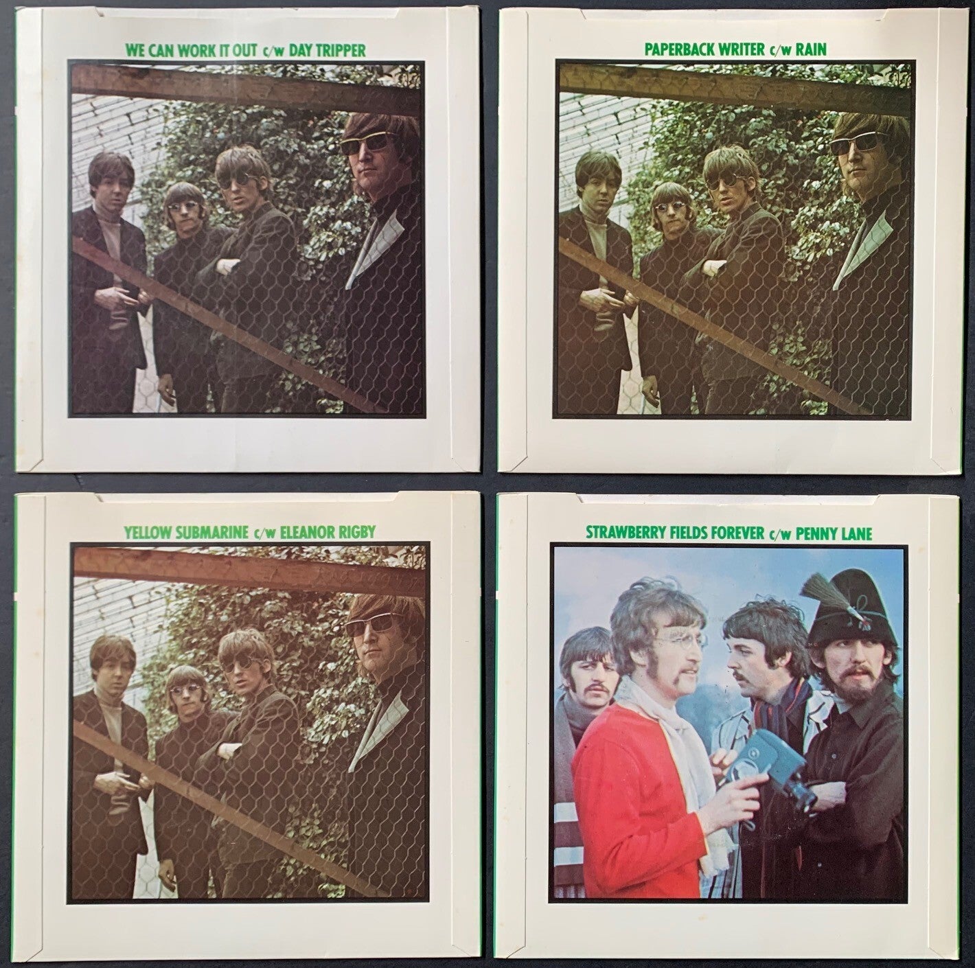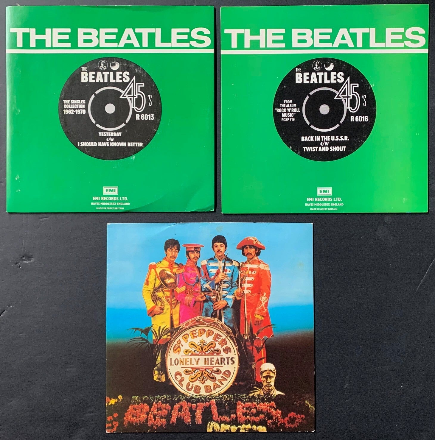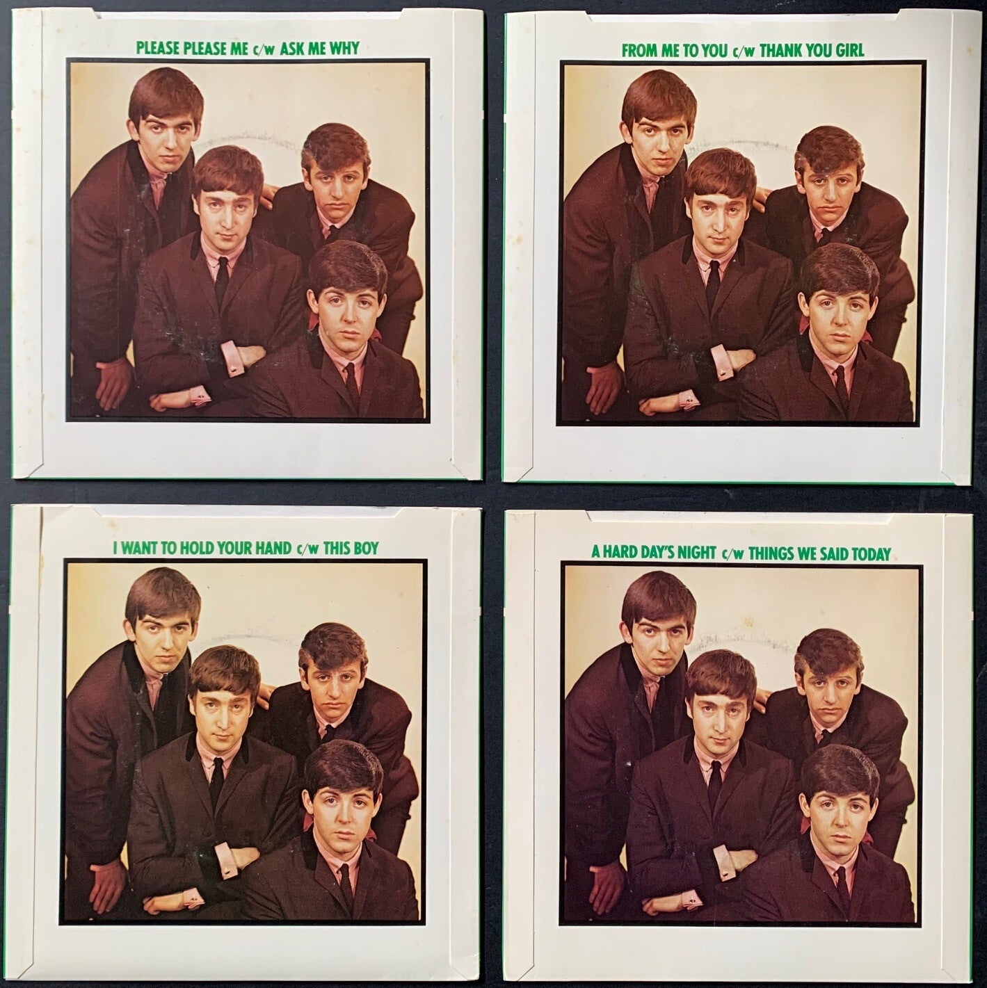 - Box set includes 24 singles in picture sleeves with 45 RPM vinyl records. One bonus record with Sgt. Peppers A Day In The Life and With A Little Help From My Friends. Original flyers and guarantee included