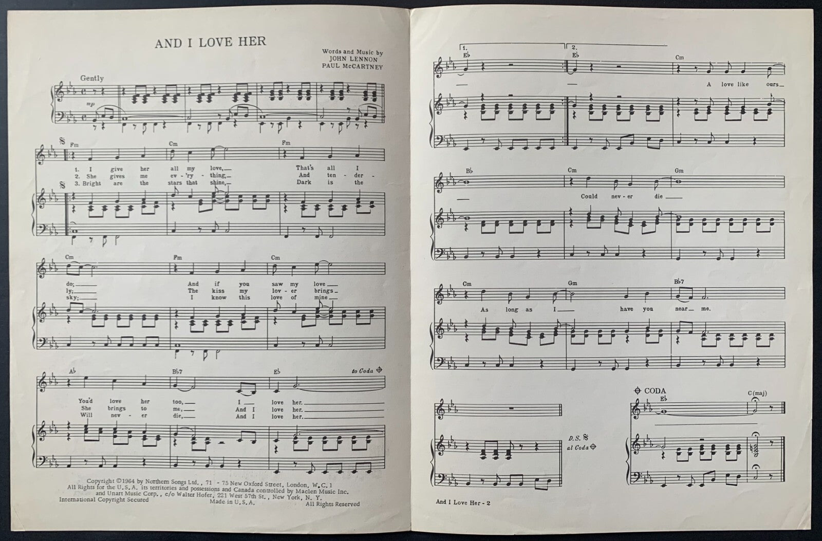 - 1964 Beatles Sheet Music And I Love Her Northern Songs Ltd.