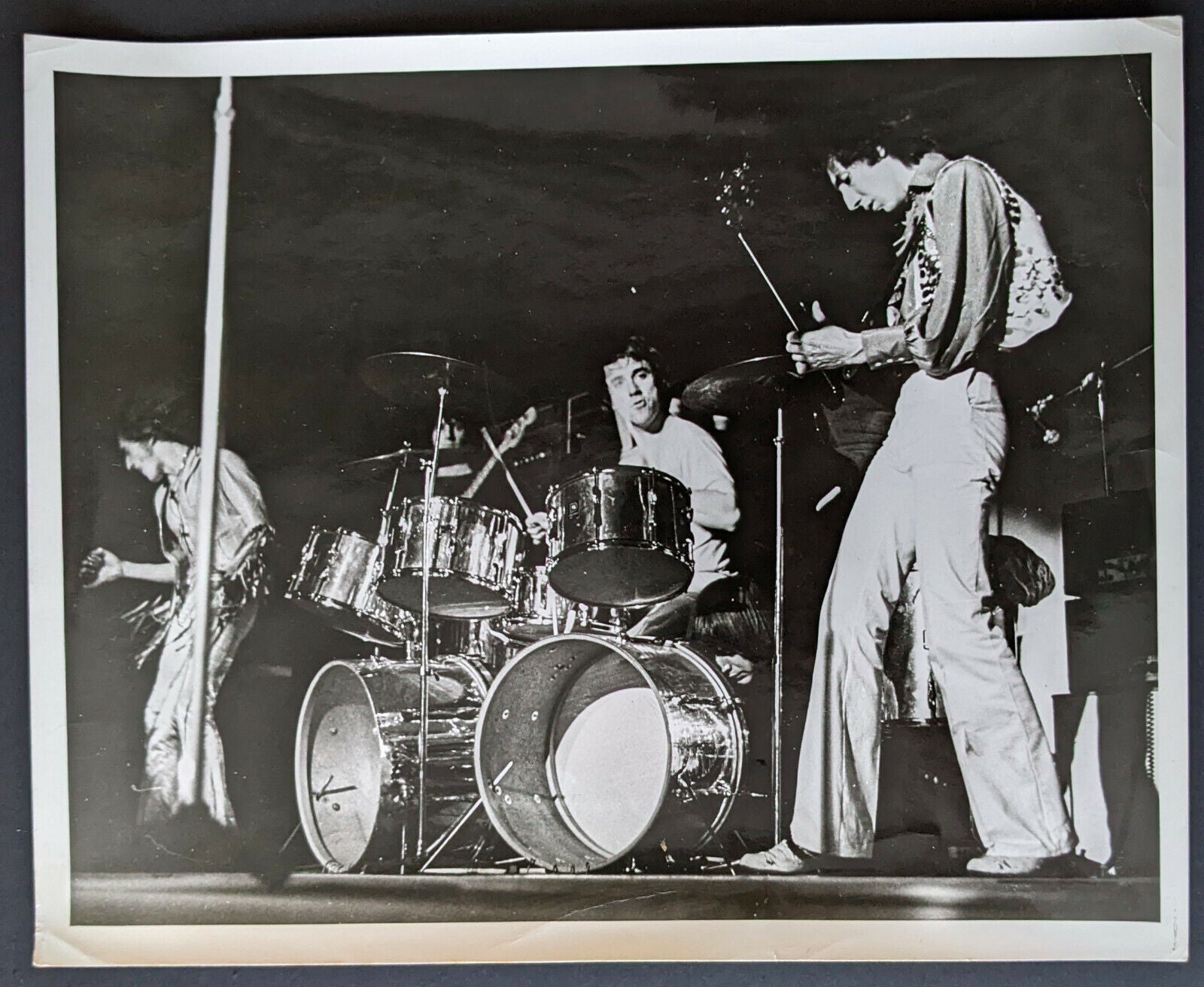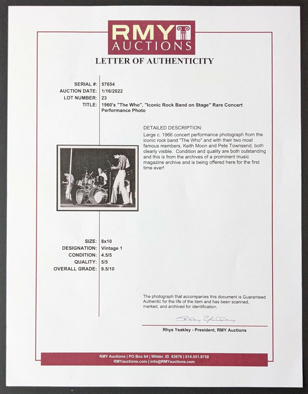 • Vintage 1966 Rare type 1 early photo of rock band The Who on stage in concert. Moon, Daltrey + Townshend in the image