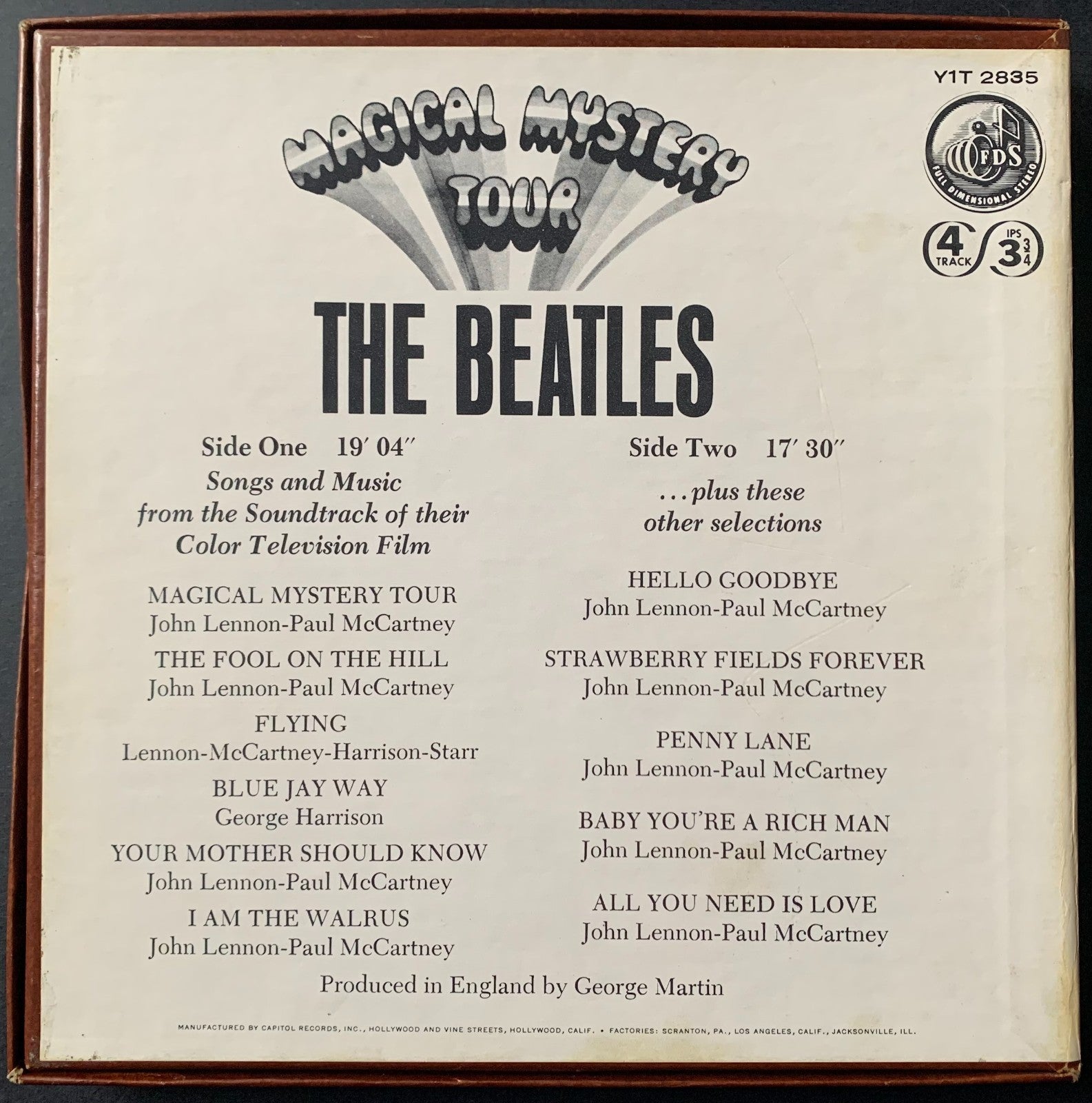 - 4 track stereo 3 3/4 IPS marked Y1T 2835 and issued by Capital Record