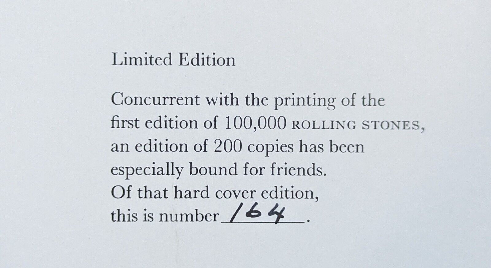 • Printed on the first page "Limited Edition: Concurrent with the printing of the first edition of 100,000 Rolling Stones, an edition of 200 copies has been especially bound for friends. Of that hard cover edition, this is number 164"