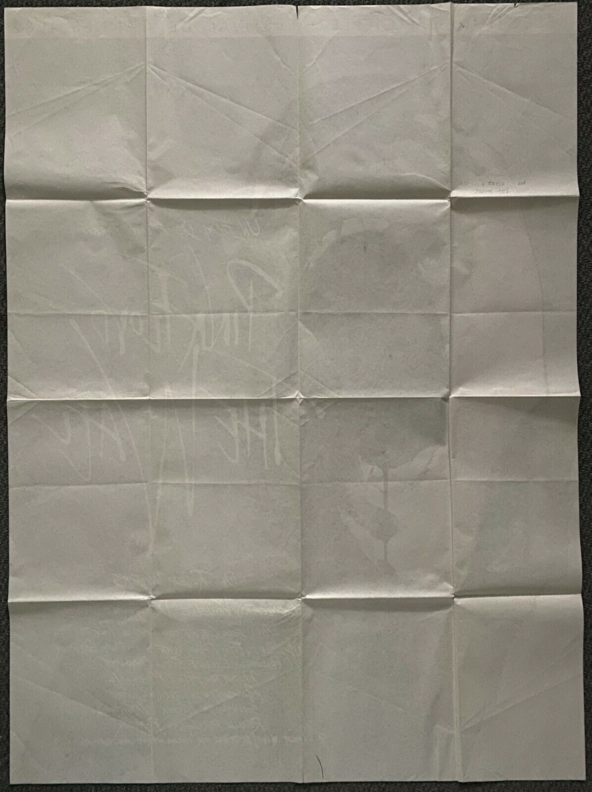 - Great condition; folding creases from mailing as well as a small tear along the top edge and a few very small holes from folding (only really visible from the back) but still presents very well