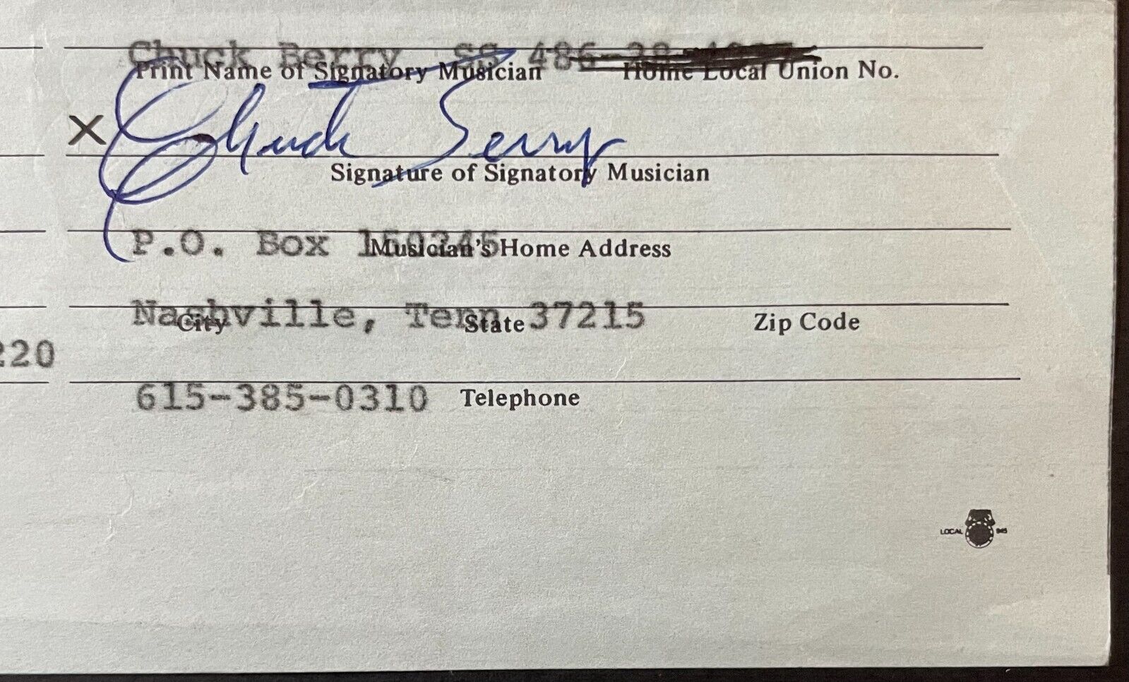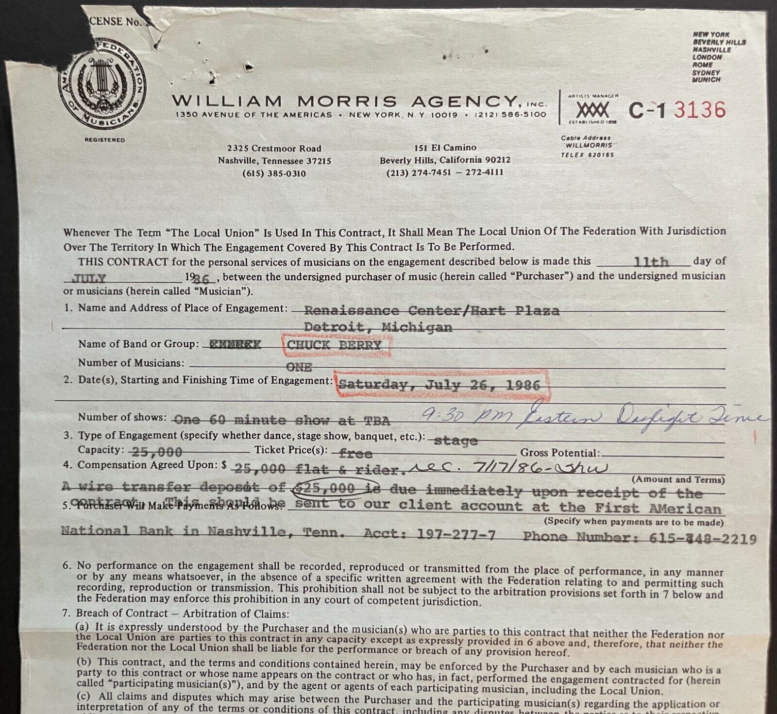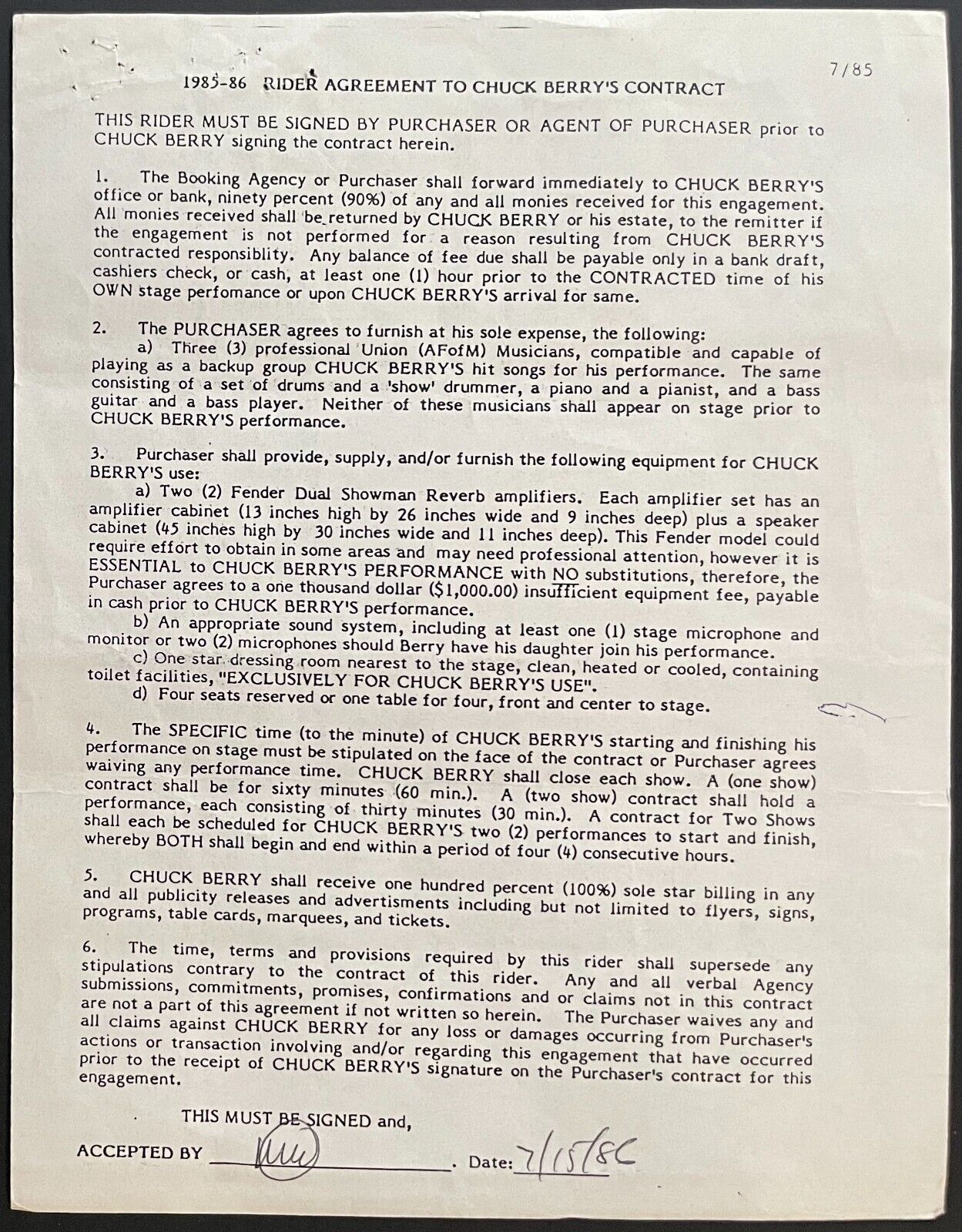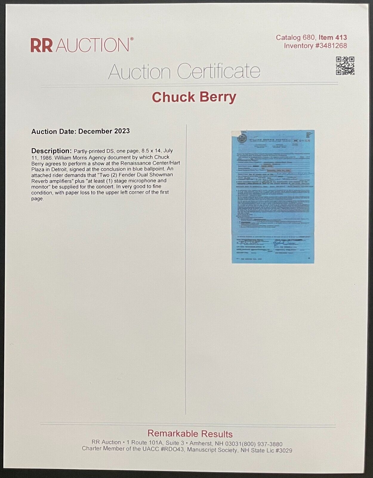 - This contract was signed by Chuck Berry in 1986 to perform a concert at the Renaissance Center in Detroit. Also included with this item is a 1 page rider for the show