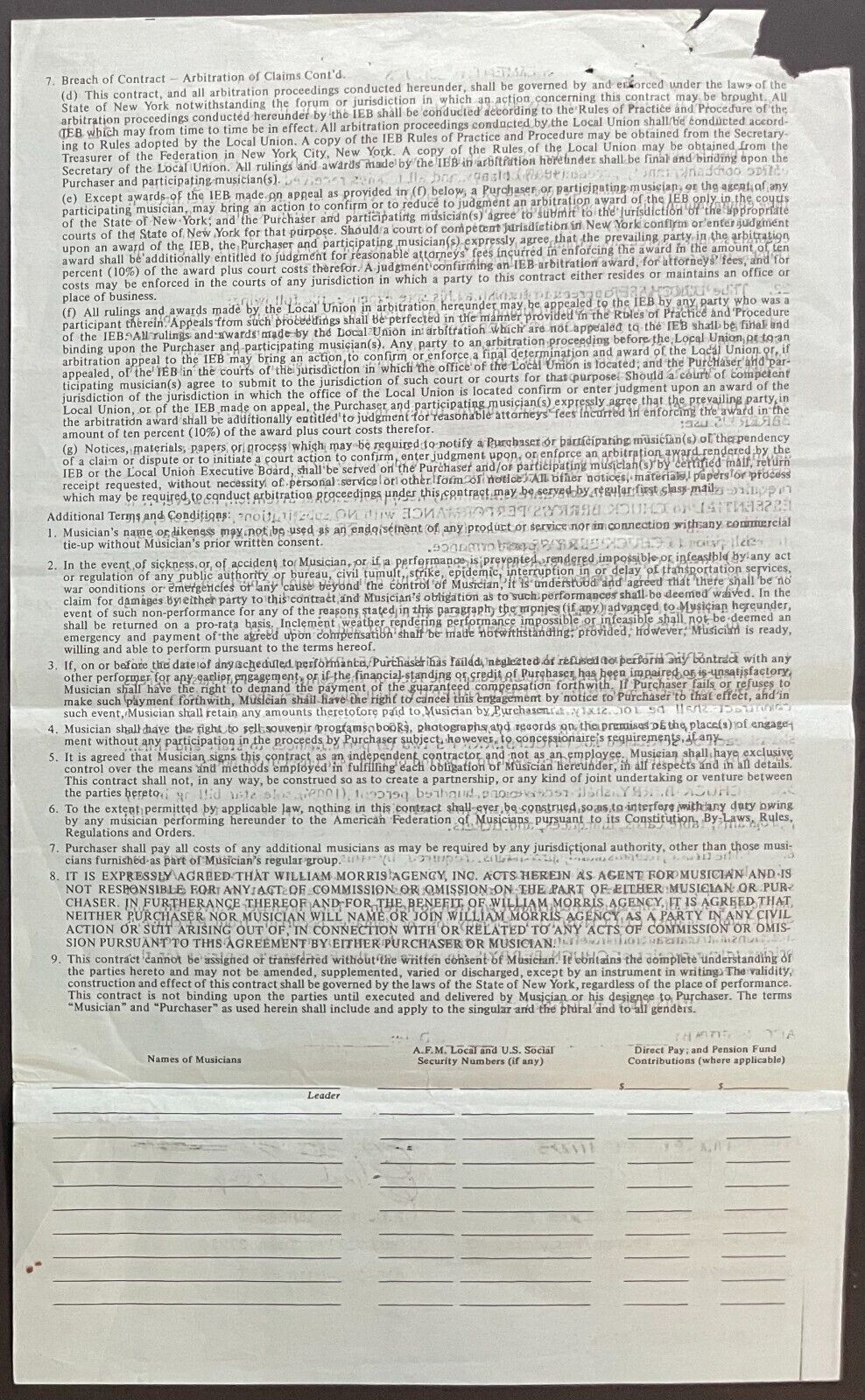 - Contract is in very good condition; material loss in the top left corner from being torn from staples, as well as multiple residual staple holes. Aside from original folding creases, little to no notable creasing, no rips or tears. Autograph shows some light smudging on the C but still presents well with no fading. Rider is in very good condition with many pinholes in the top left corner as well as a pen mark on the right margin. Aside from original folding creases, little to no notable creasing and no rips or tears, but edgewear is visible throughout