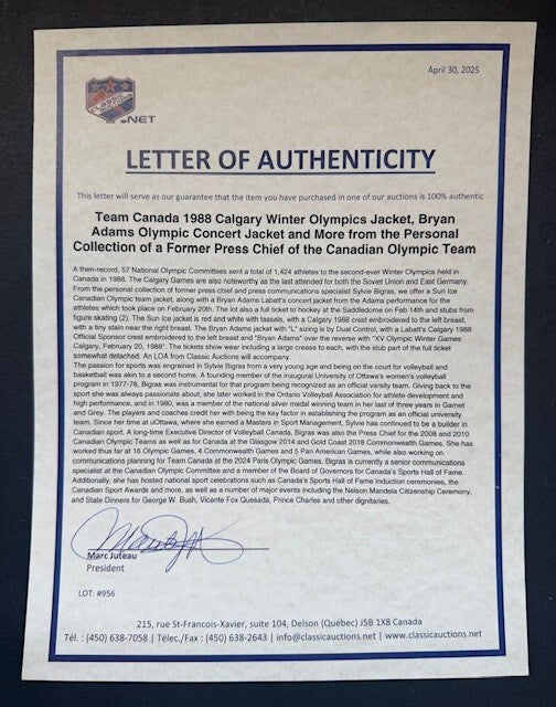 - Originally from the personal collection of Sylvie Bigras, Press Chief and Press Communications Specialist for the Canadian Olympic Team. This jacket was available only to Olympic personnel during Adams' exclusive concert for the Canadian Olympic Team on February 20, 1988