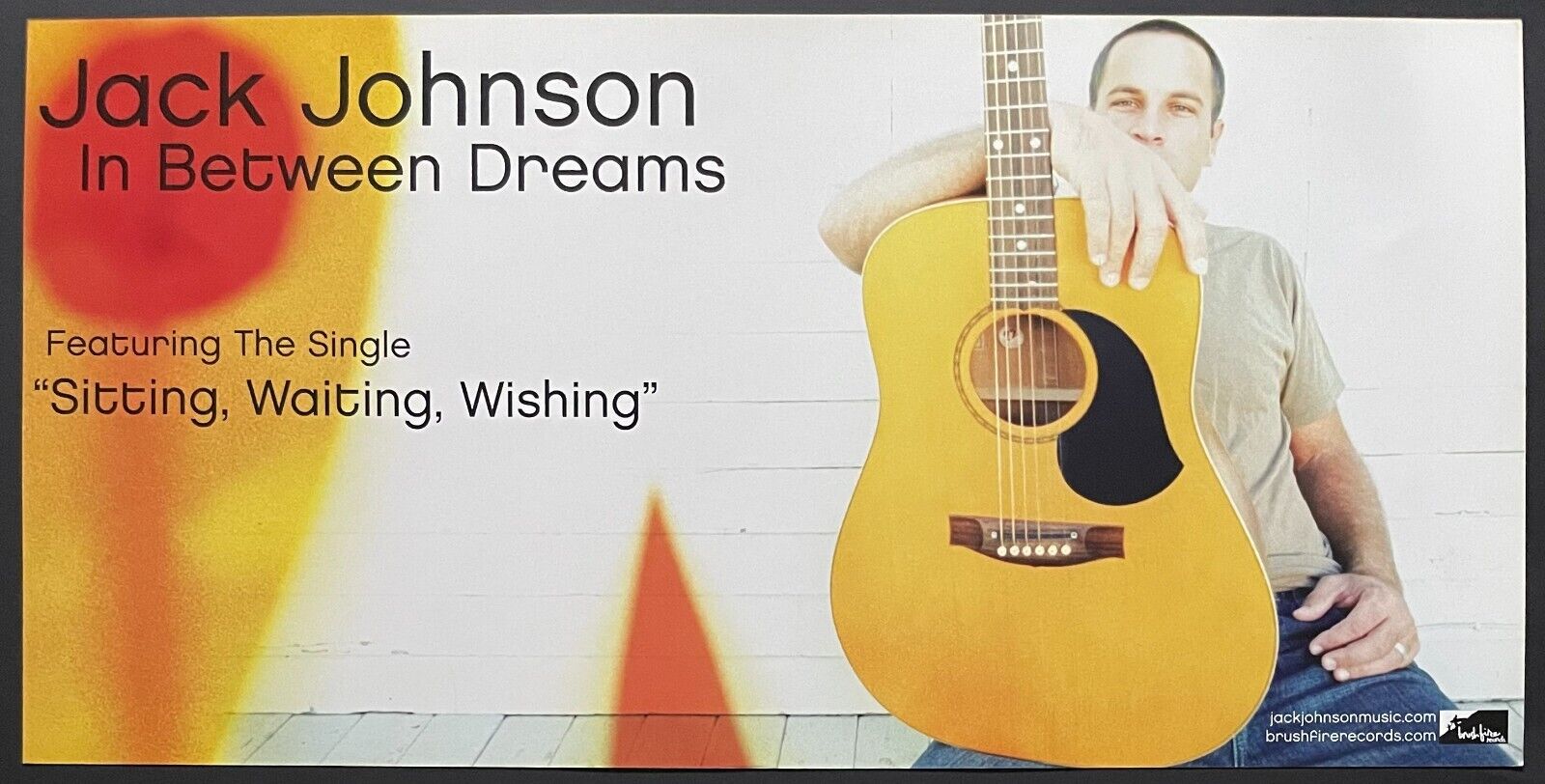 • Jack Johnson signed 2002 record store poster to promote his studio album In Between Dreams, featuring the single "Sitting, Waiting, Wishing"