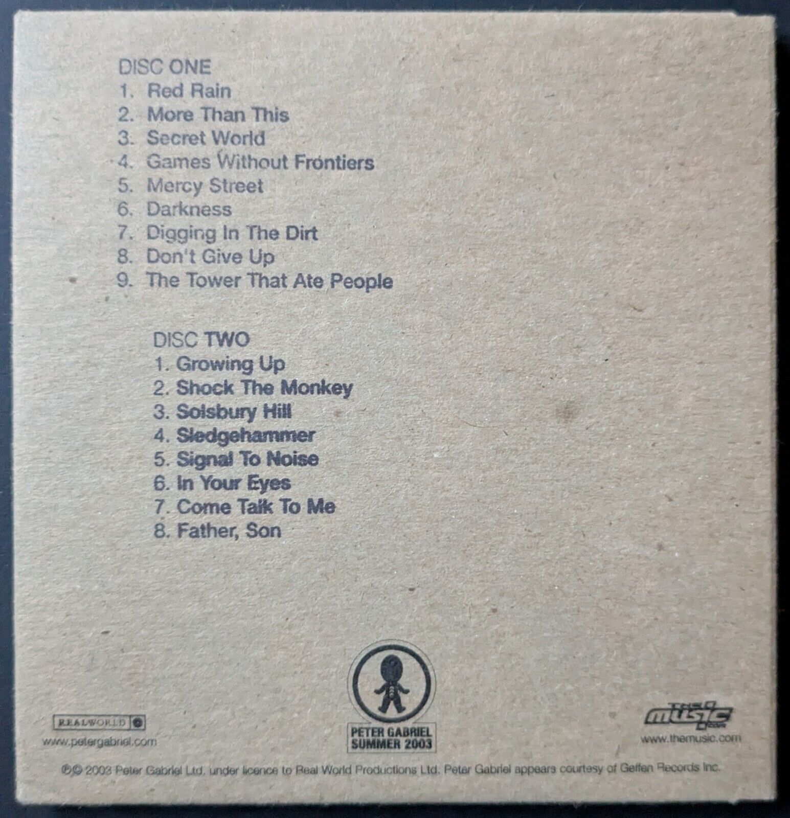 - Peter Gabriel signed autographed sleeve for double CD of Live Dallas concert performed on June 11th 2003
