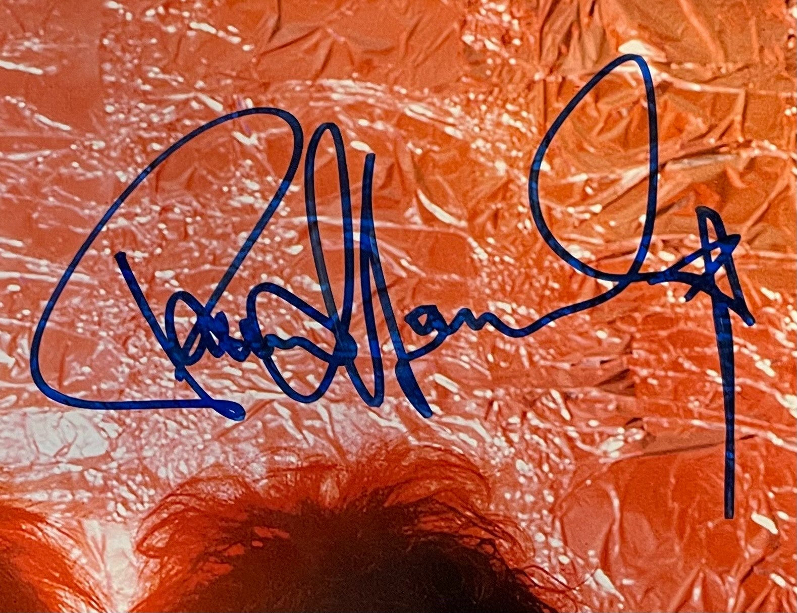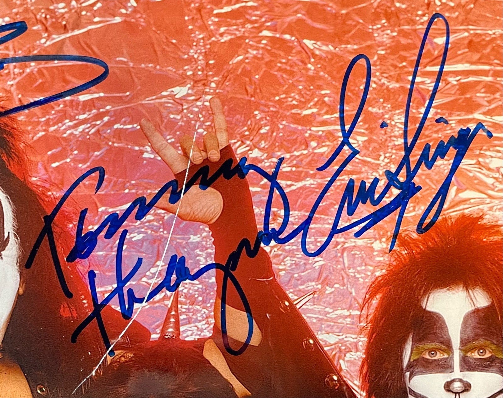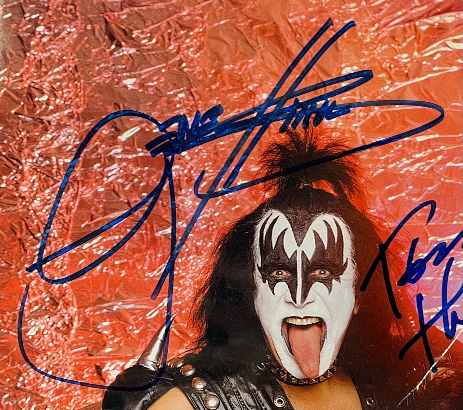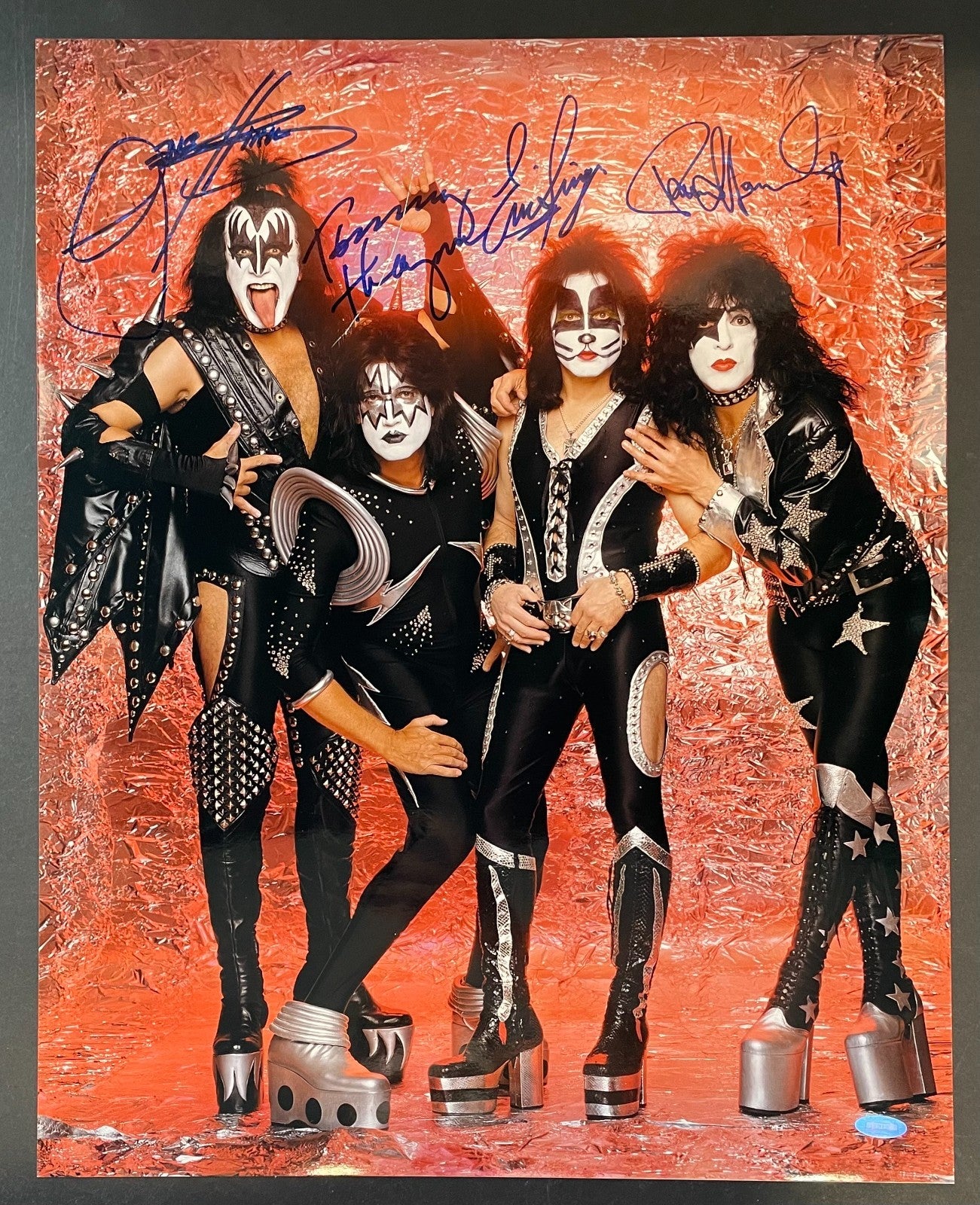 - Gene Simmons, Paul Stanley, Eric Singer and Tommy Thayer are pictured in their on-stage costumes and makeup on a red shimmering background, with each signing above their images with large blue marker ink signatures