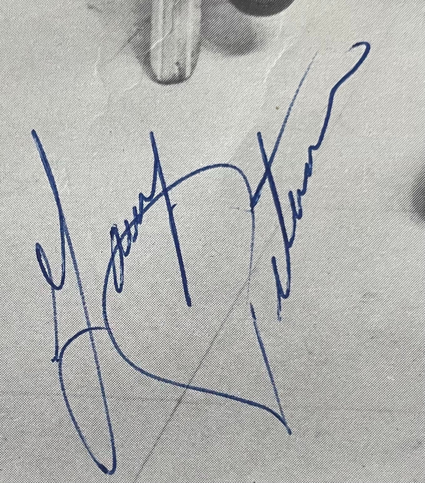 - Very good condition: light creasing, notable edgewear, tear visible in the centre, paper residue on the back, autograph presents well with no smudging or bleeding