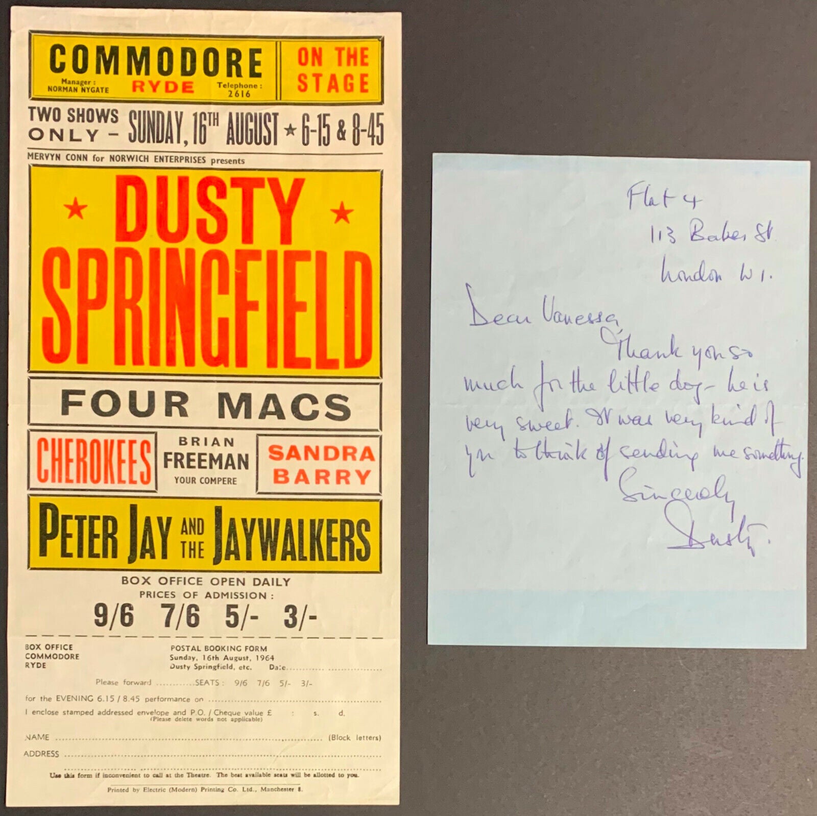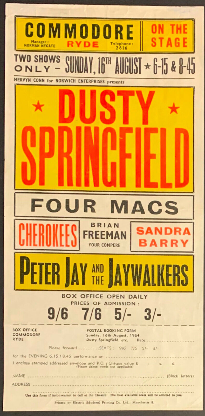 - The second item is an original colour 5.5 x 11.25 handbill for two Dusty Springfield shows at the Commodore in Ryde on August 16, 1964, which lists the supporting acts as Four Macs, the Cherokees, Sandra Barry and Peter Jay and the Jaywalkers