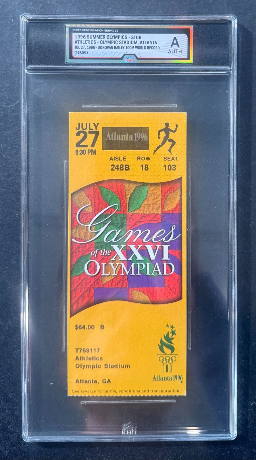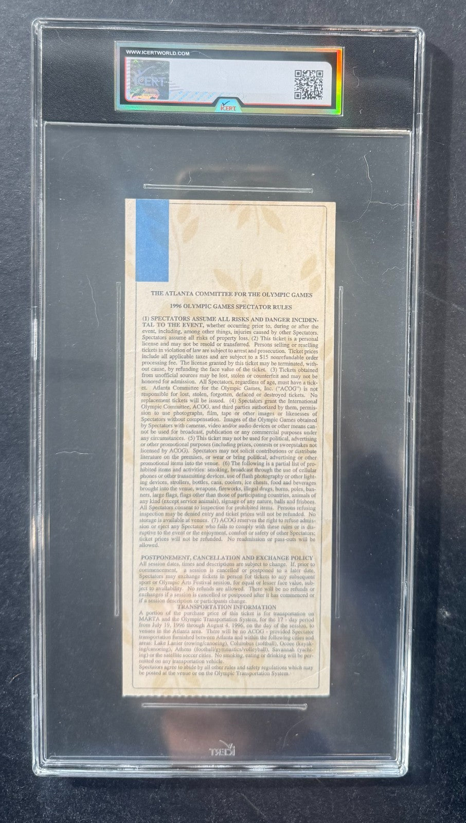 - Excellent condition; slabbed and graded A Authentic by iCert. One small crease in bottom corner. Clean entry tear. Images present very well. Watermarked the 100th anniversary of the 1896 Summer Olympics