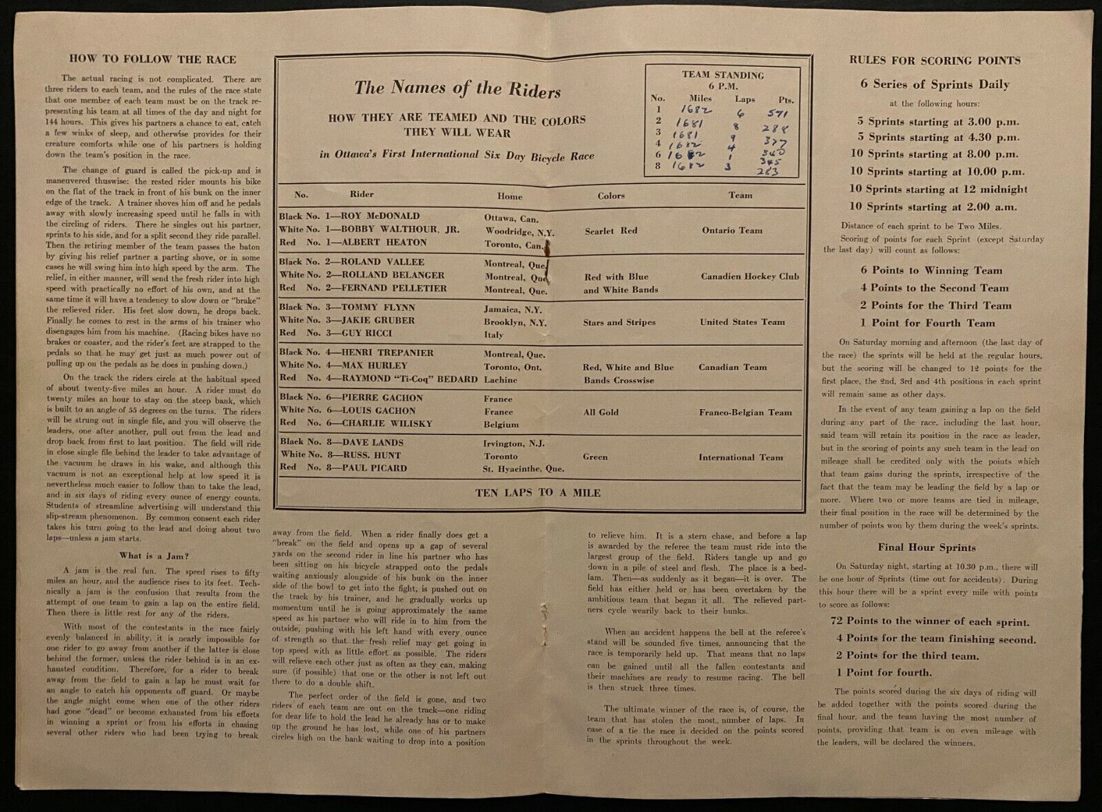 - September 27, 1936 program for Ottawa's First International Six-Day Bike Rice in Ottawa, Ontario