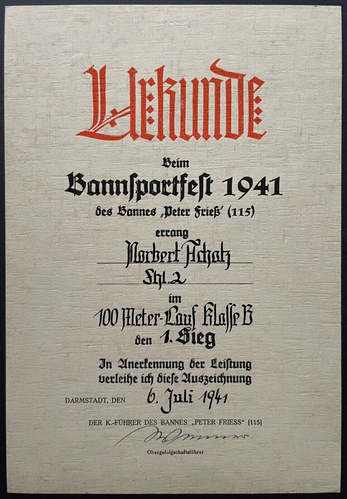 - July 6, 1941 athletic competition certificate, won by Norbert Achatz for the 100 meter sprint