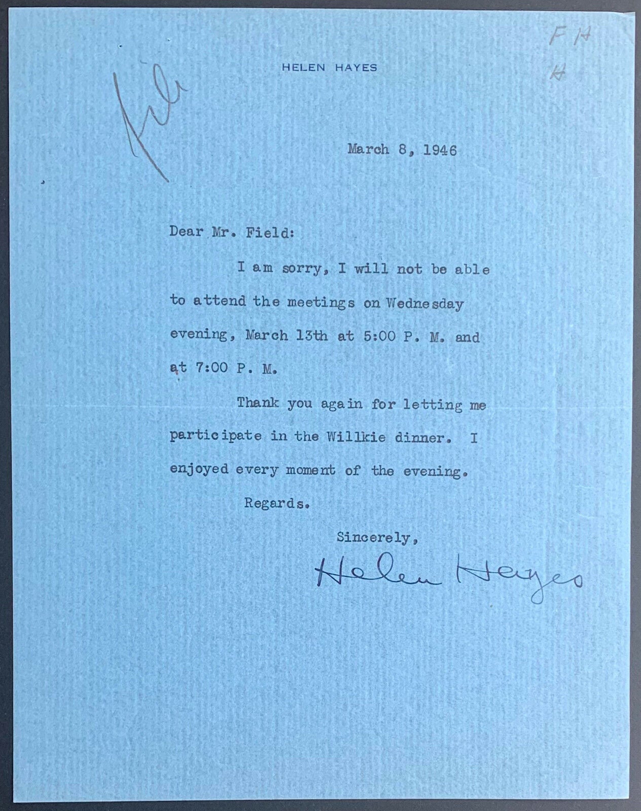 - Helen Hayes American actress typed and signed letter dated March 8, 1946