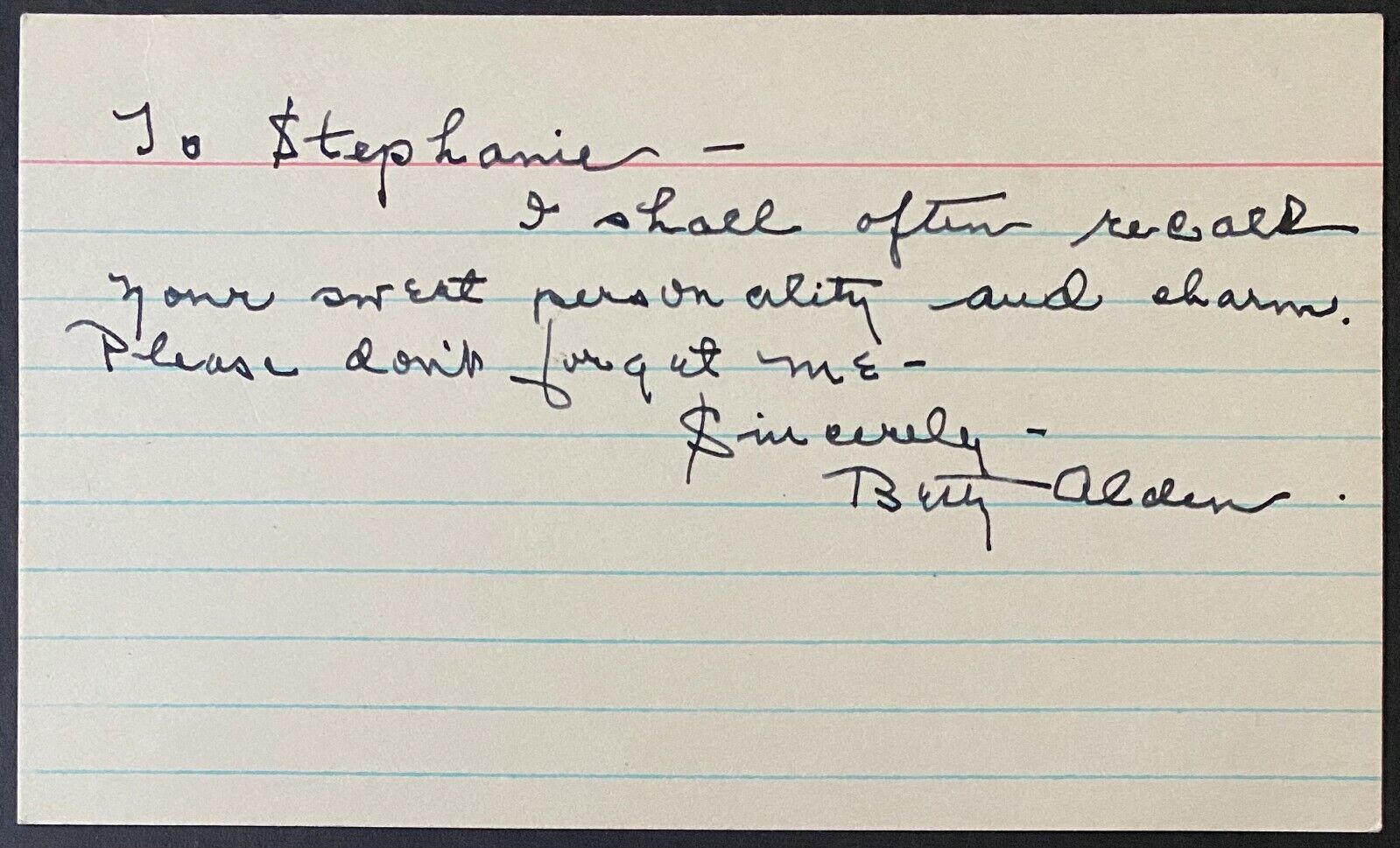 - Content reads "To Stephanie, I shall often recall your great personality and charm. Please don't forget me. Sincerely, Betty Alden"