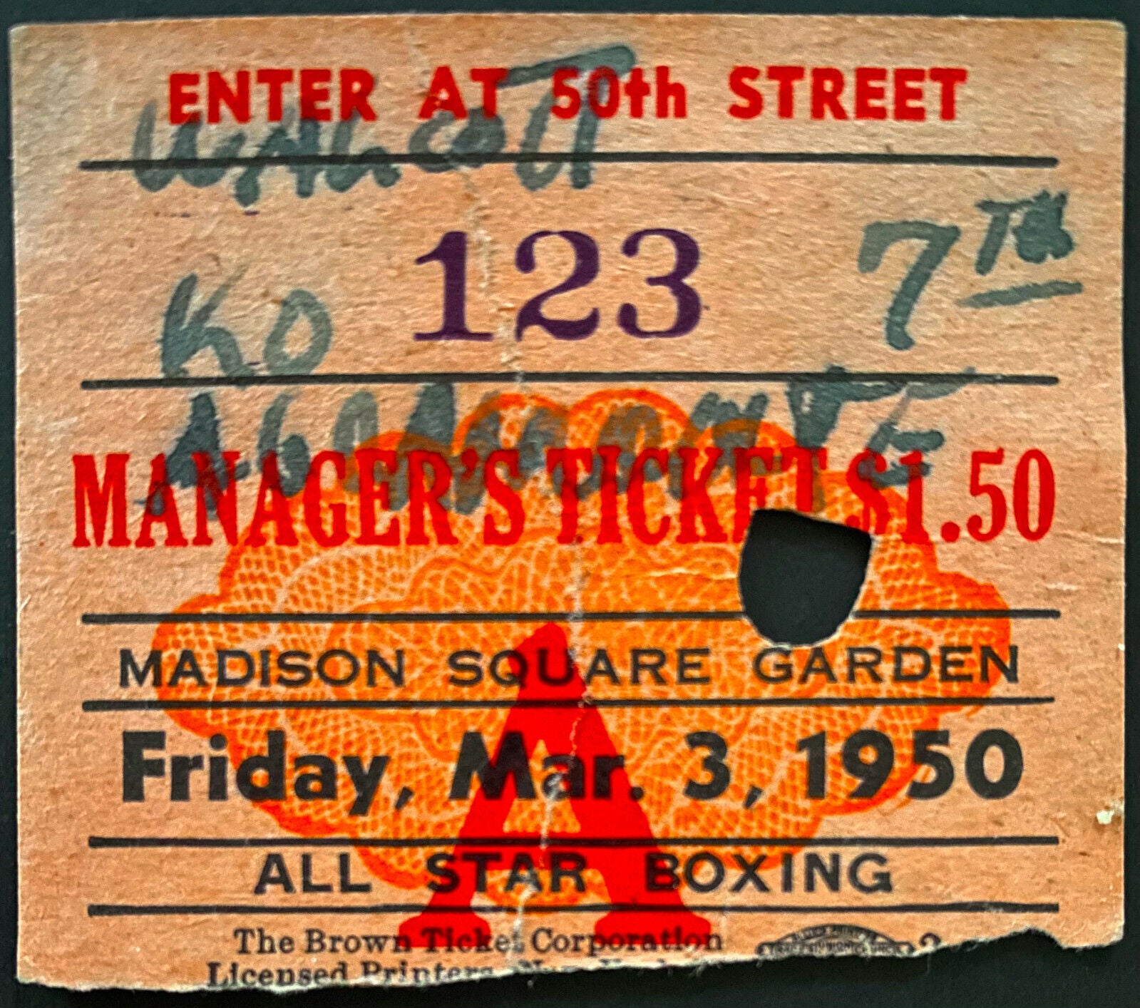 - March 3rd, 1950 Madison Square Gardens boxing ticket