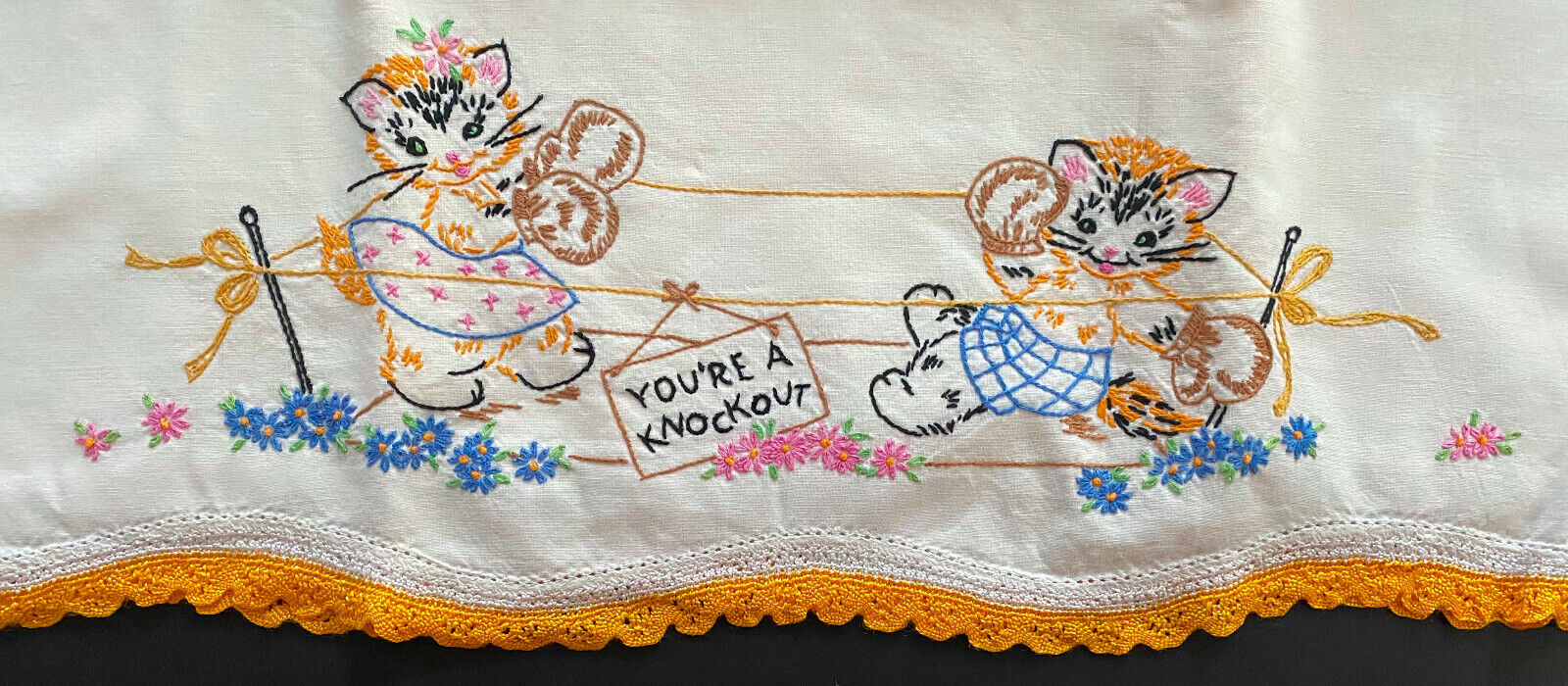 - 1950's Needlepoint pillow case with a boxing theme. 2 Cats boxing in a ring with a sign hanging from rope with writing on it "You're A Knockout"