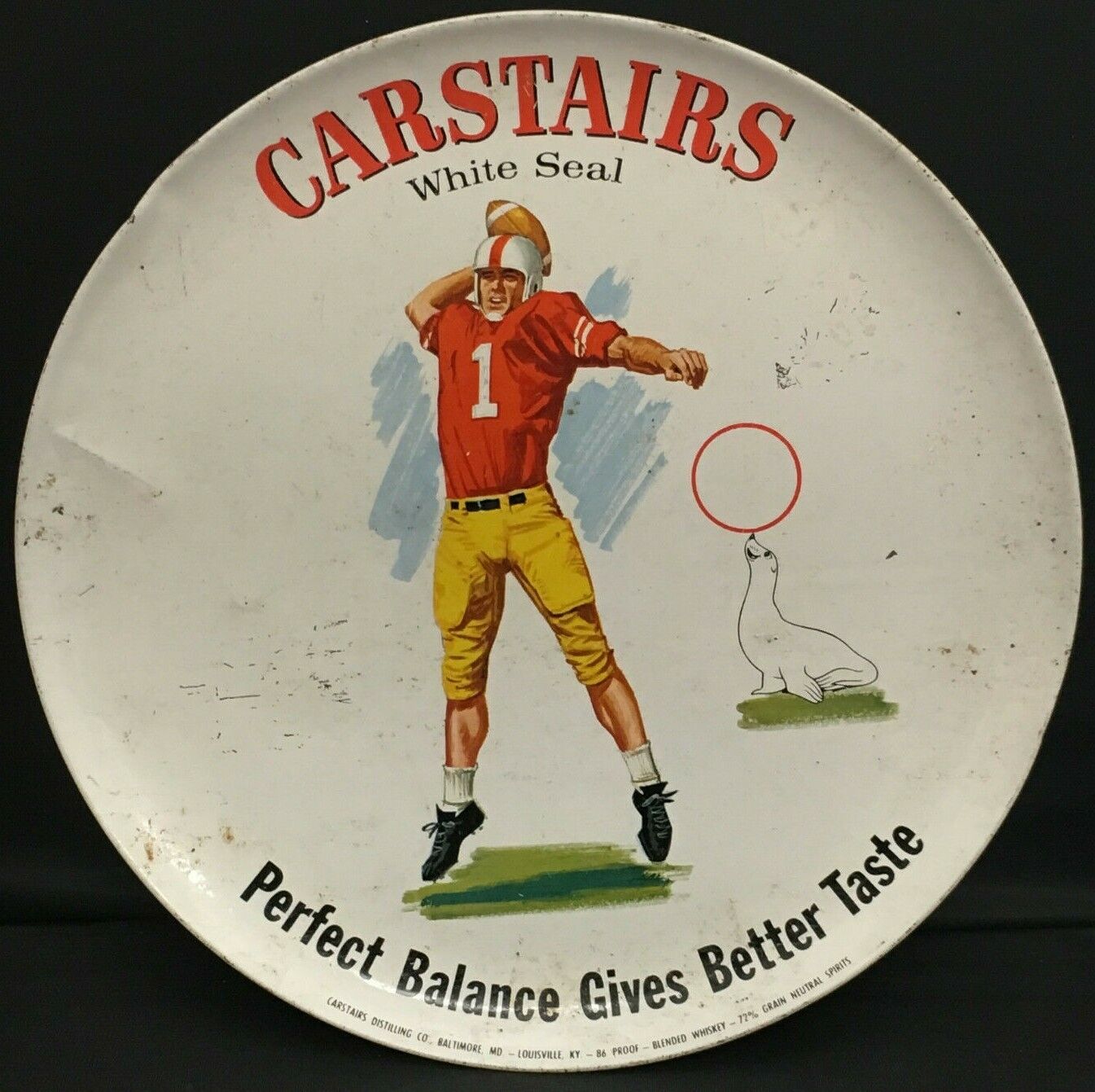 1950's vintage Carstairs White Seal whiskey tray. The tin advertising tray measures 11” in diameter and features a football player catching a ball.