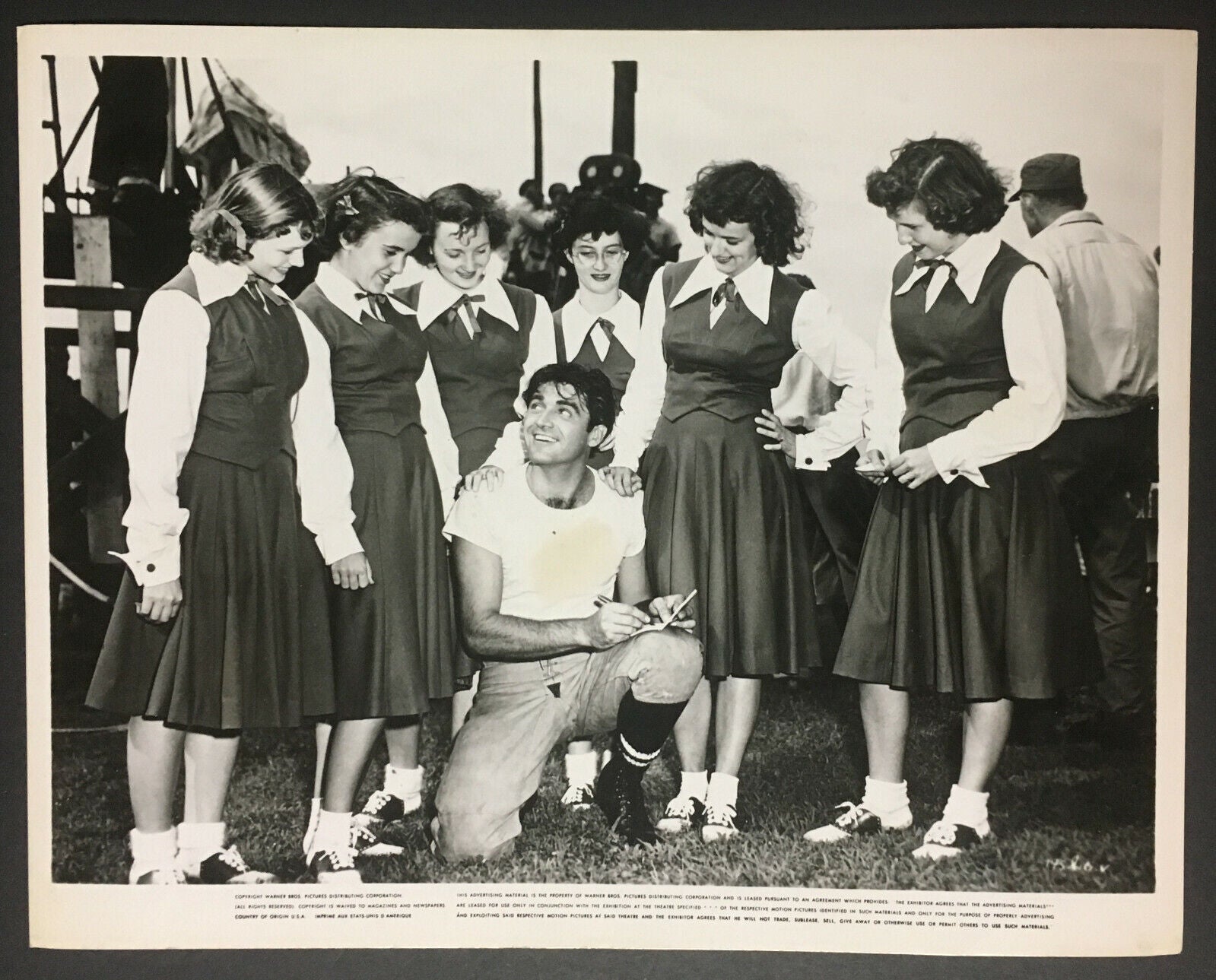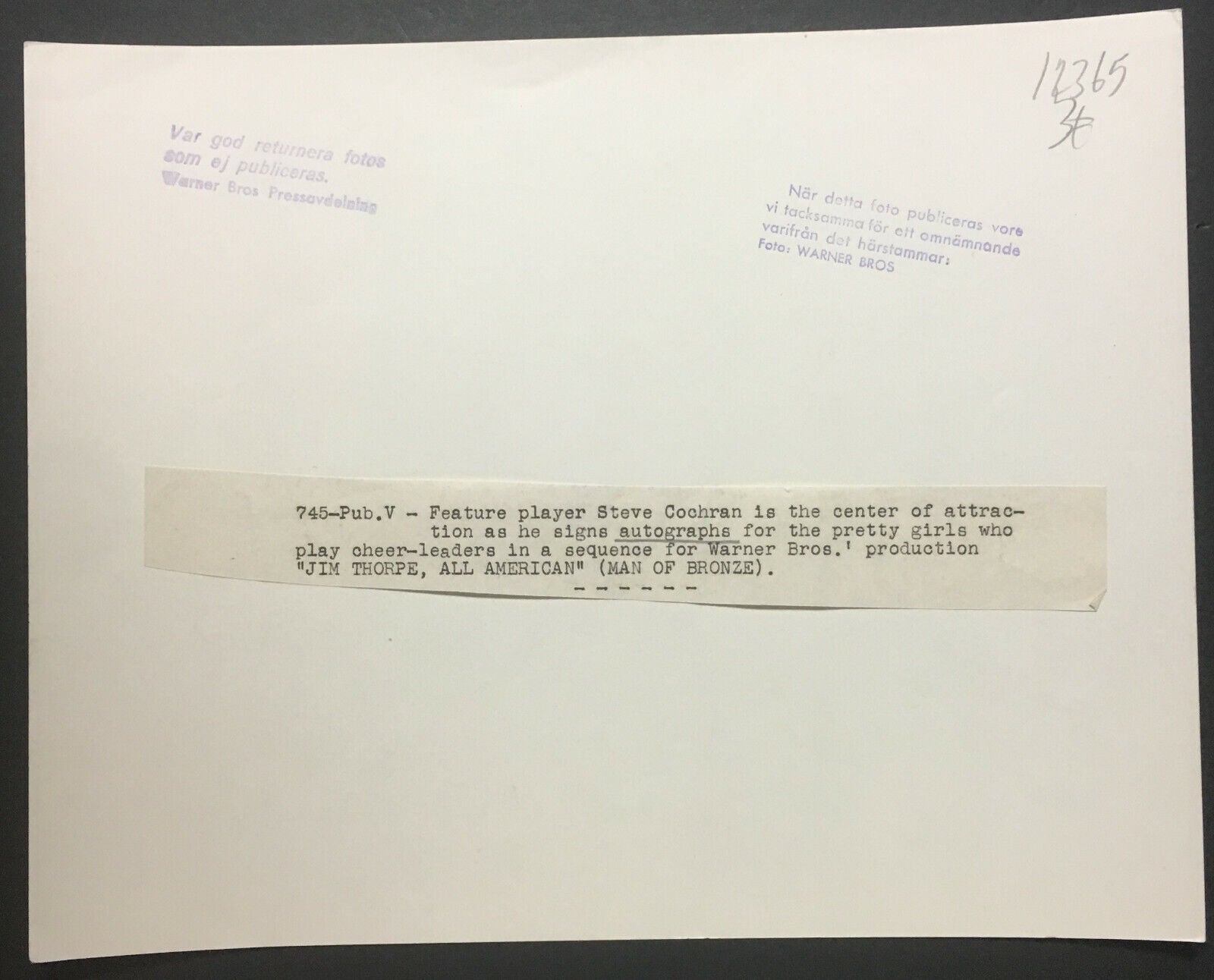 - 1951 movie publicity photo Steve Cochran the center of attraction as he signs autographs for cheerleaders in a sequence for Warner Bros. Production "Jim Thorpe, All American" (Man Of Bronze)