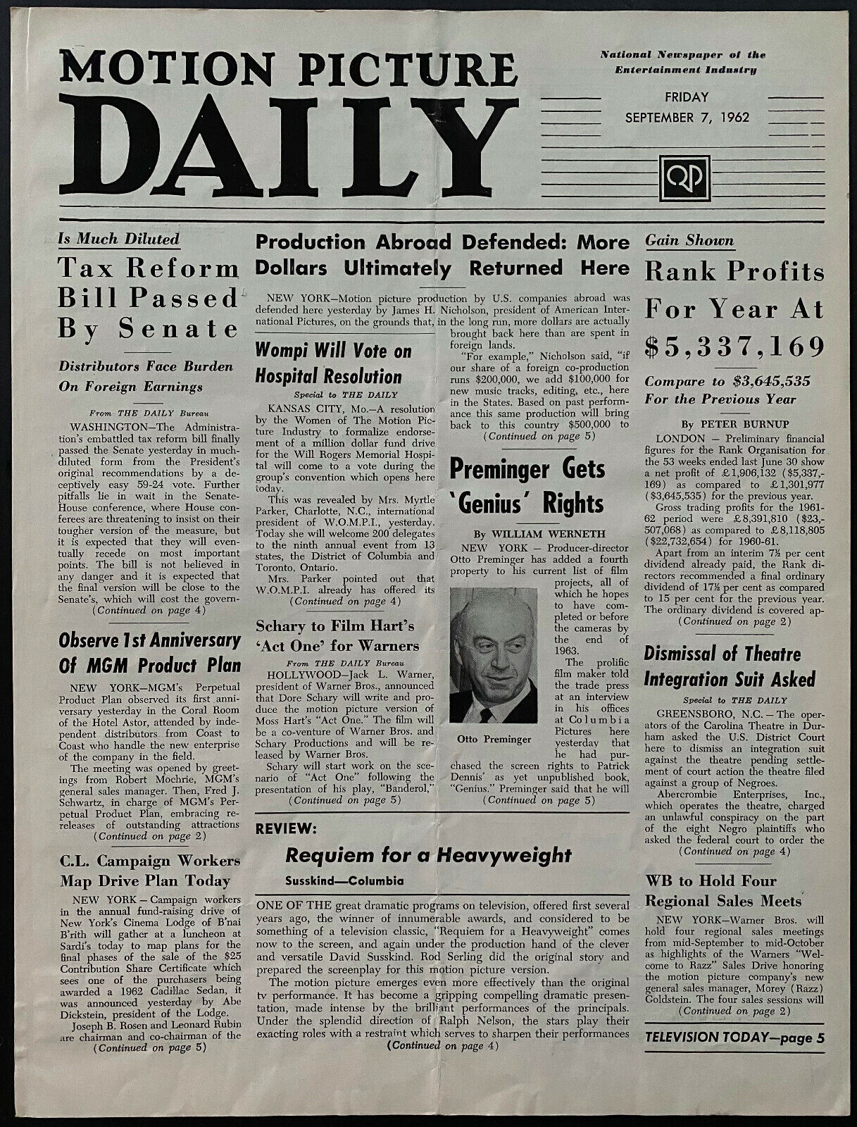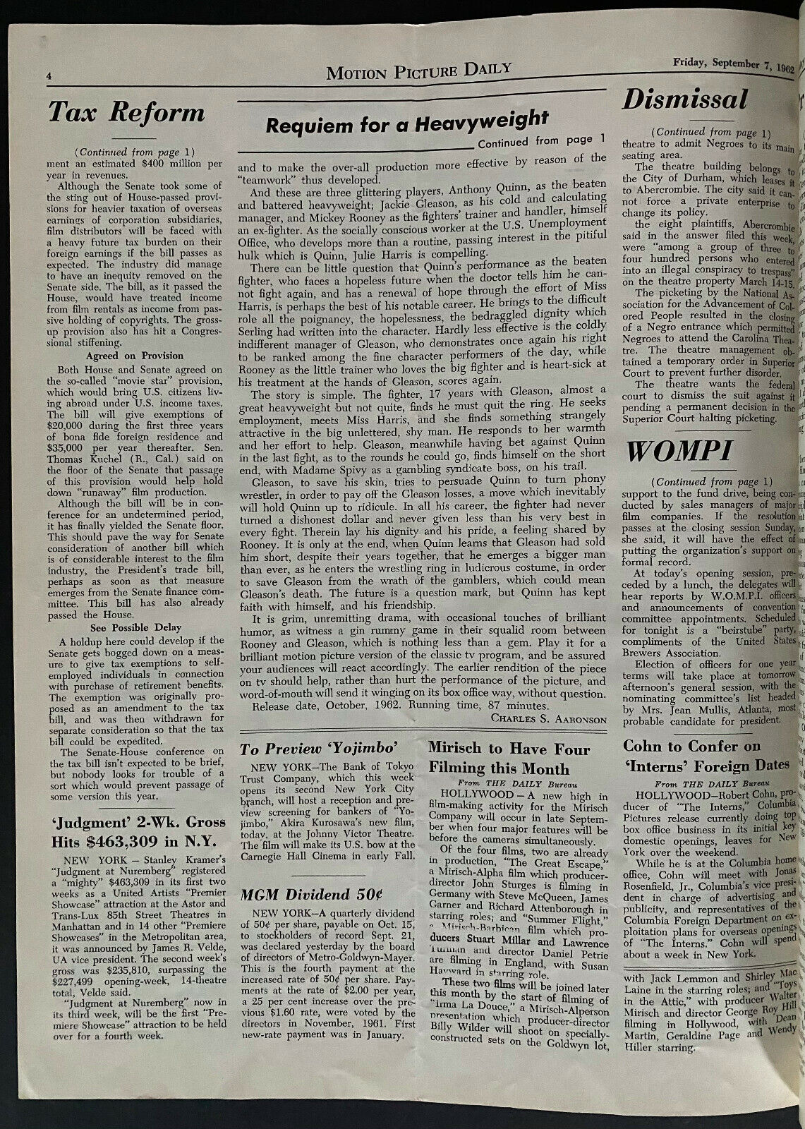 • 1962 Motion Picture Daily Complete 6 Page Boxing Magazine