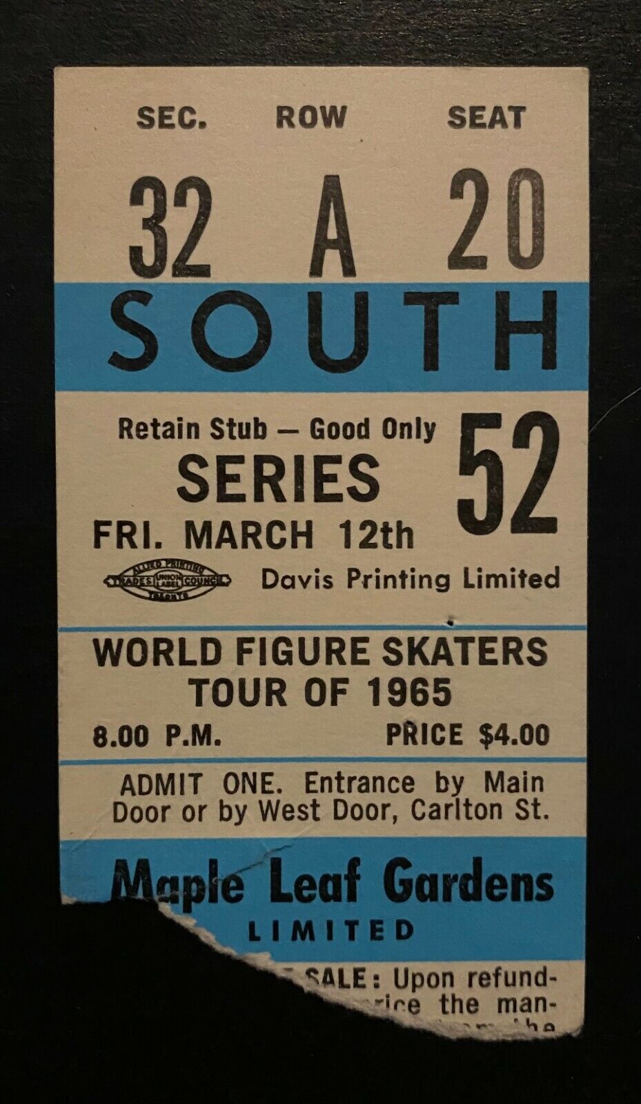 - March 12, 1965 ticket stub and lineup card for the World Figure Skating Tour Series at Maple Leaf Gardens in Toronto, Ontario