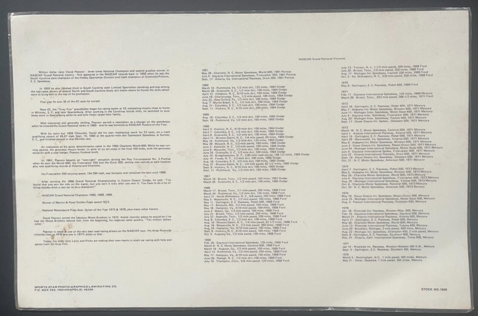 - 1978 Laminated David Pearson NASCAR Photo Placemat