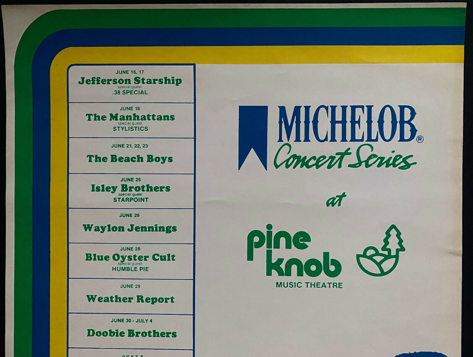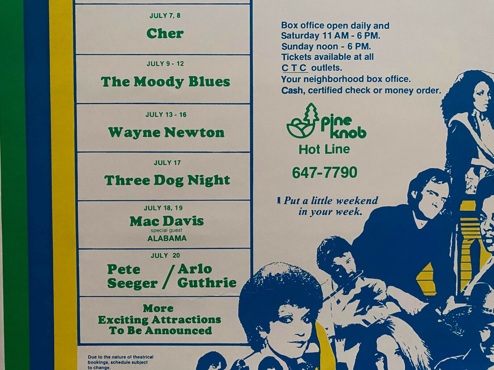 - 1981 Pine Knob Music Theatre original concert poster with many greats appearing that includes Cher, Pete Seeger, Beach Boys, Jefferson Starship and many more