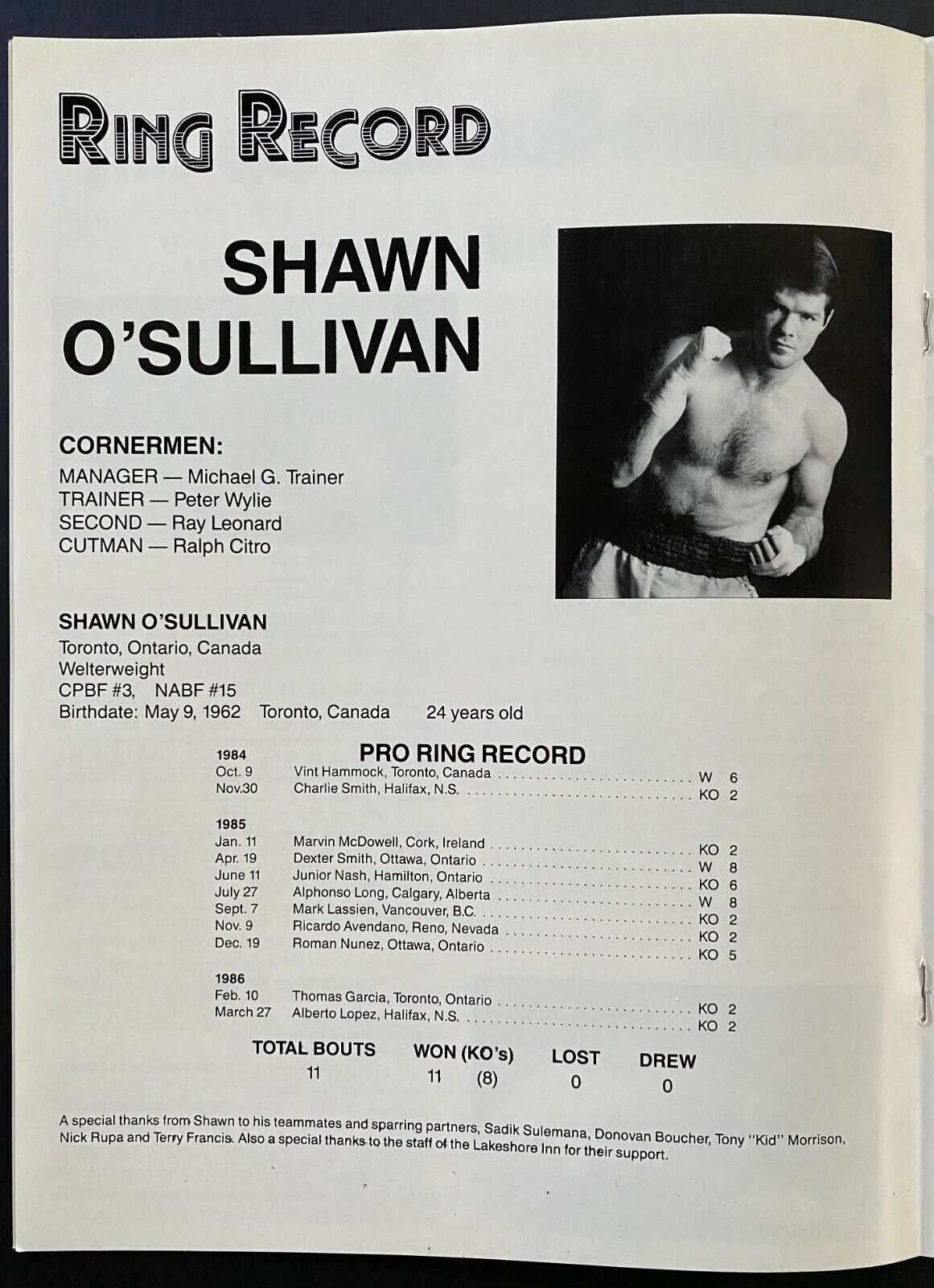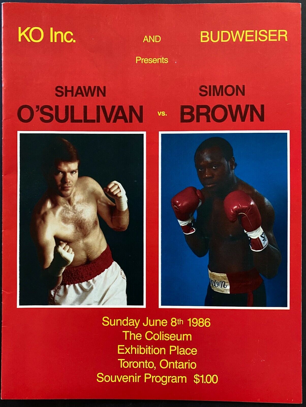 - 1986 boxing program from fight between Simon Brown and Shawn O'Sullivan at Exhibition Stadium Coliseum in Toronto, Ontario