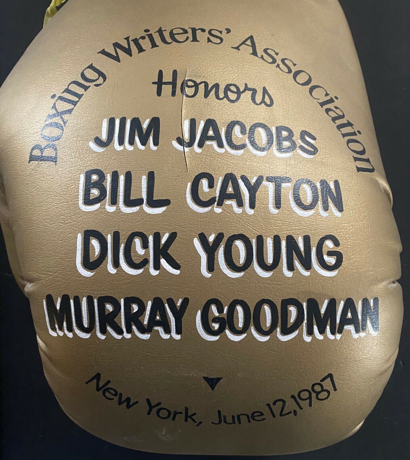 - June 12, 1987 over-sized boxing glove put on display at the Boxing Writers' Association in New York City to honor four men for their contributions to boxing