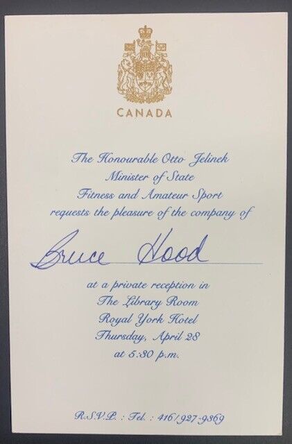 - April 28th, 1988 Calgary Winter Olympics Canadian Government Dinner held at Royal York Hotel in Toronto official invitation to long time NHL Referee Bruce Hood. 4 items included Invitation + Menu + other items attribute to the dinner