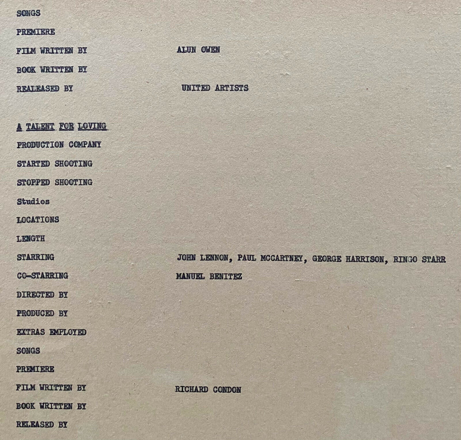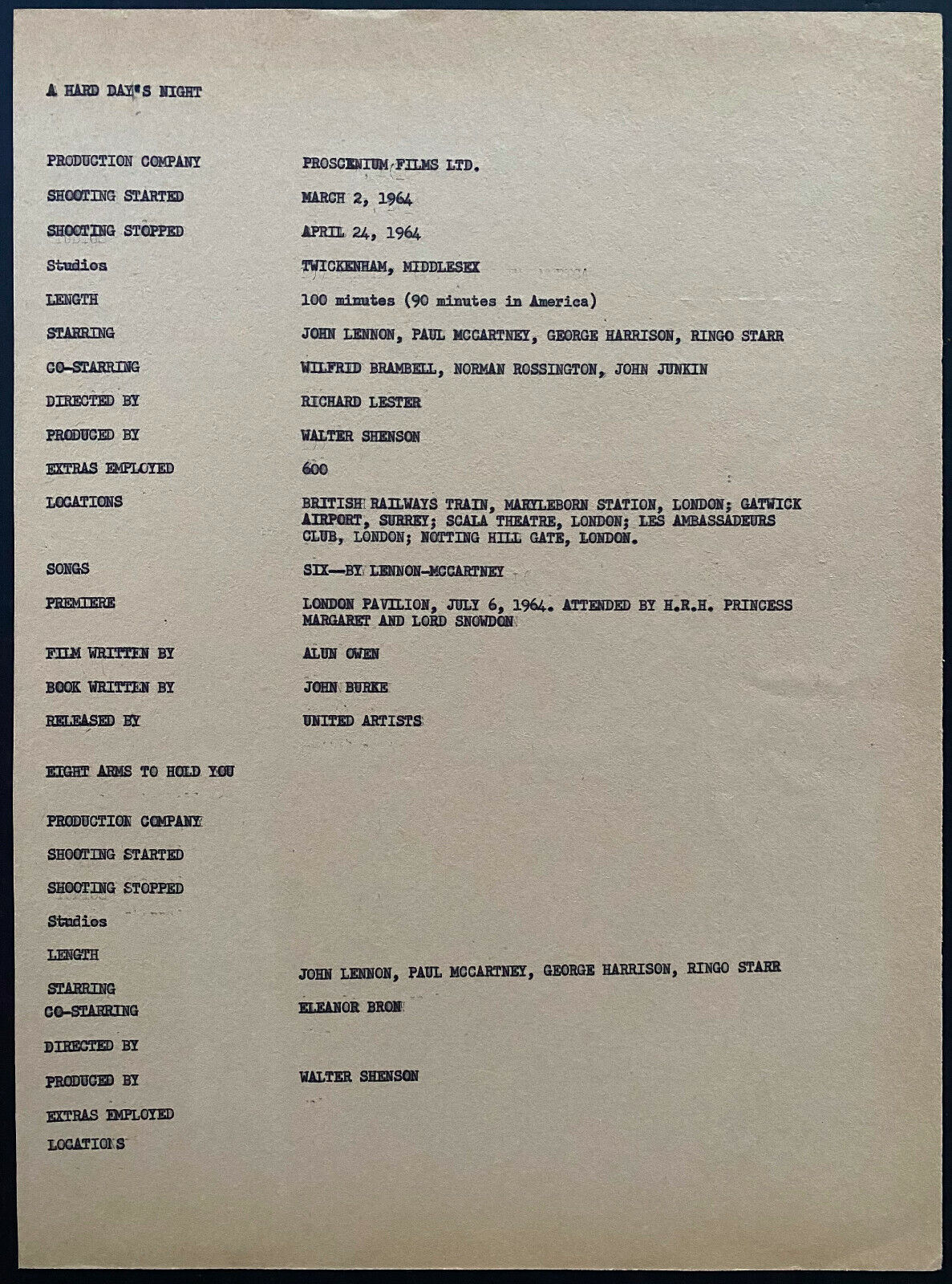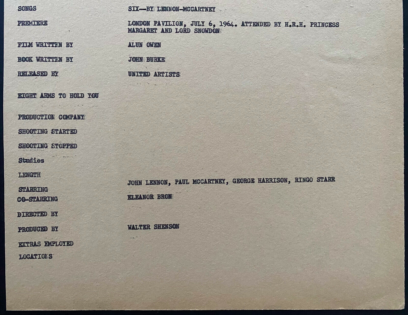 - Also details for upcoming 2nd Beatles movie "8 Arms To Hold You" as well on the back are details for proposed Beatles movie A Talent For Living" in 1965 Walter Shenson the scheduled producer of the movie offered to star the Beatles, Brian Epstein (their manager) rejected the offer