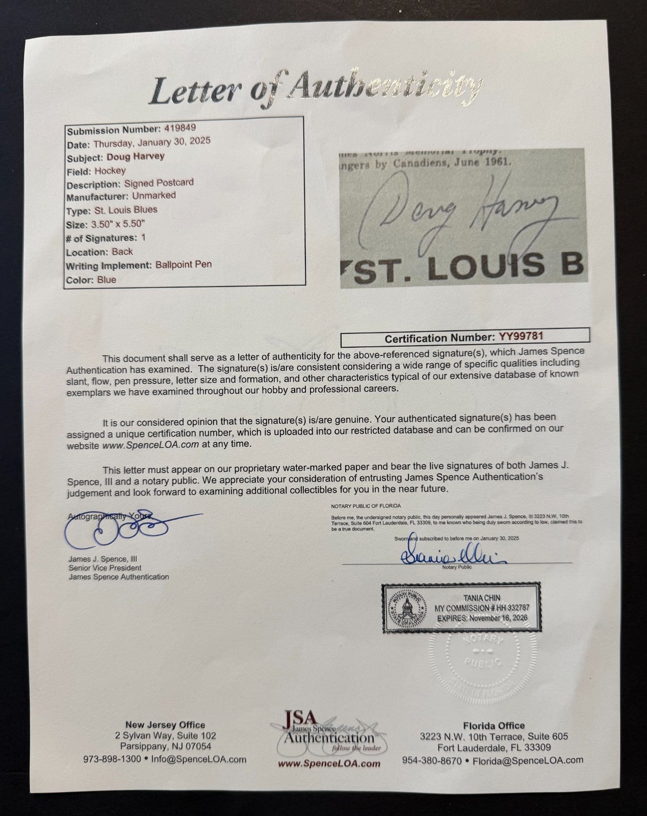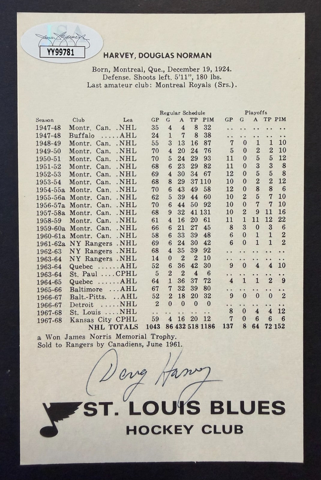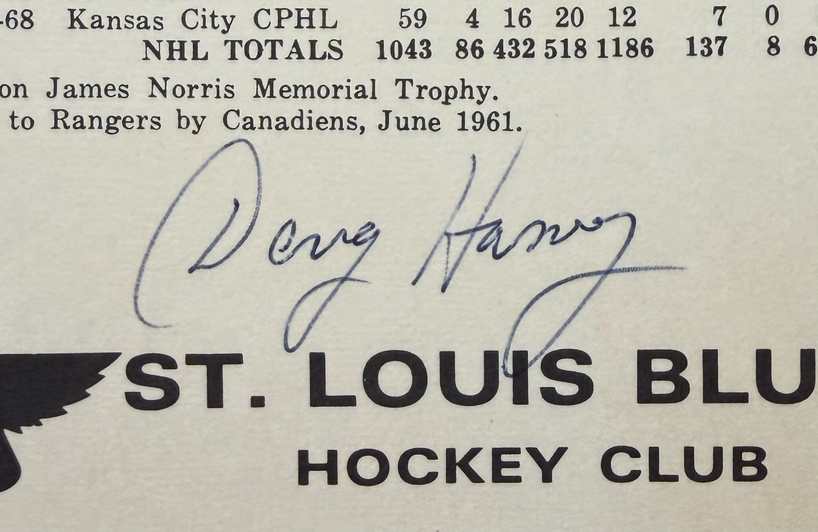 - Doug Harvey signed 1968/69 St. Louis Blues team issued postcard