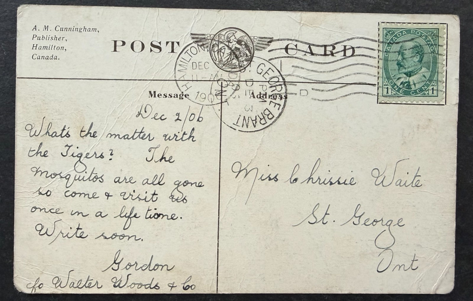 - Very good condition; minor corner and edge wear. Some faint spots of discoloration. Stamped on reverse. Writing on front and back of postcard