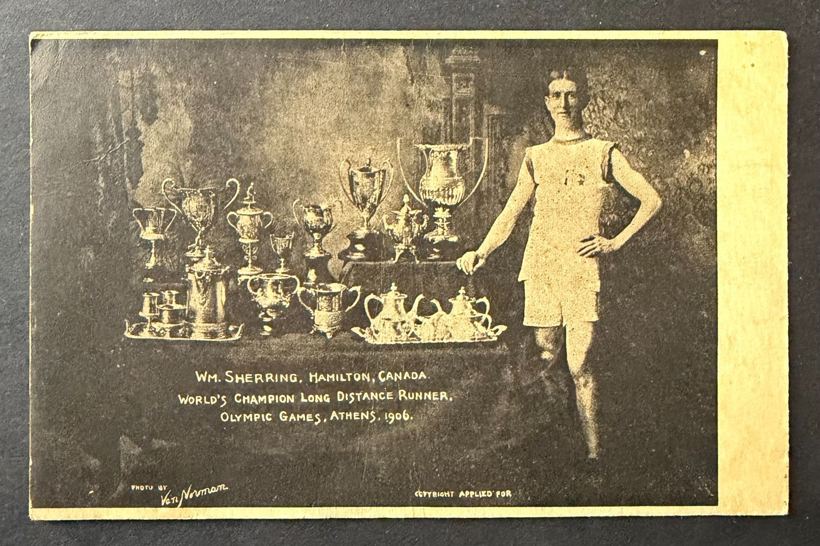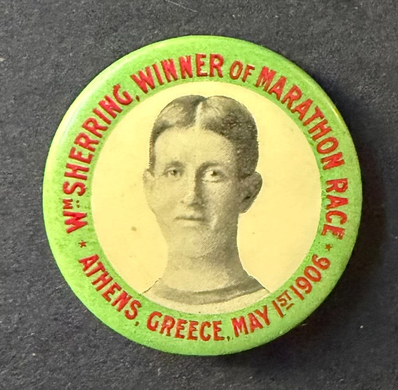- William Sherring vintage 1906 pinback and postcard celebrating his victory in the marathon at the 1906 Olympics in Athens