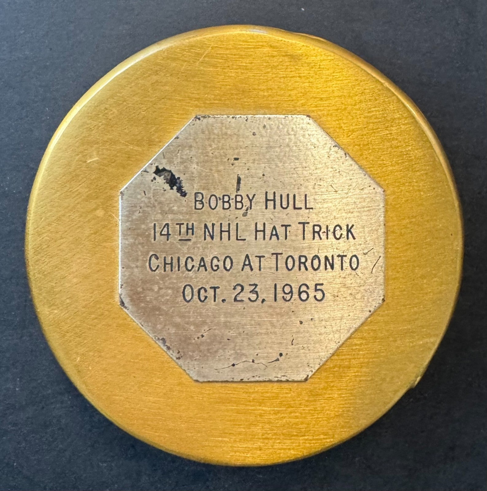 - Gold plated game puck from Oct. 23, 1965 game at Maple Leaf Gardens in Toronto. Puck was used to score Bobby Hull's 3rd goal of the game at 11:22 of the 3rd period. Puck was dipped in real gold to honor Hull's nickname "The Golden Jet".