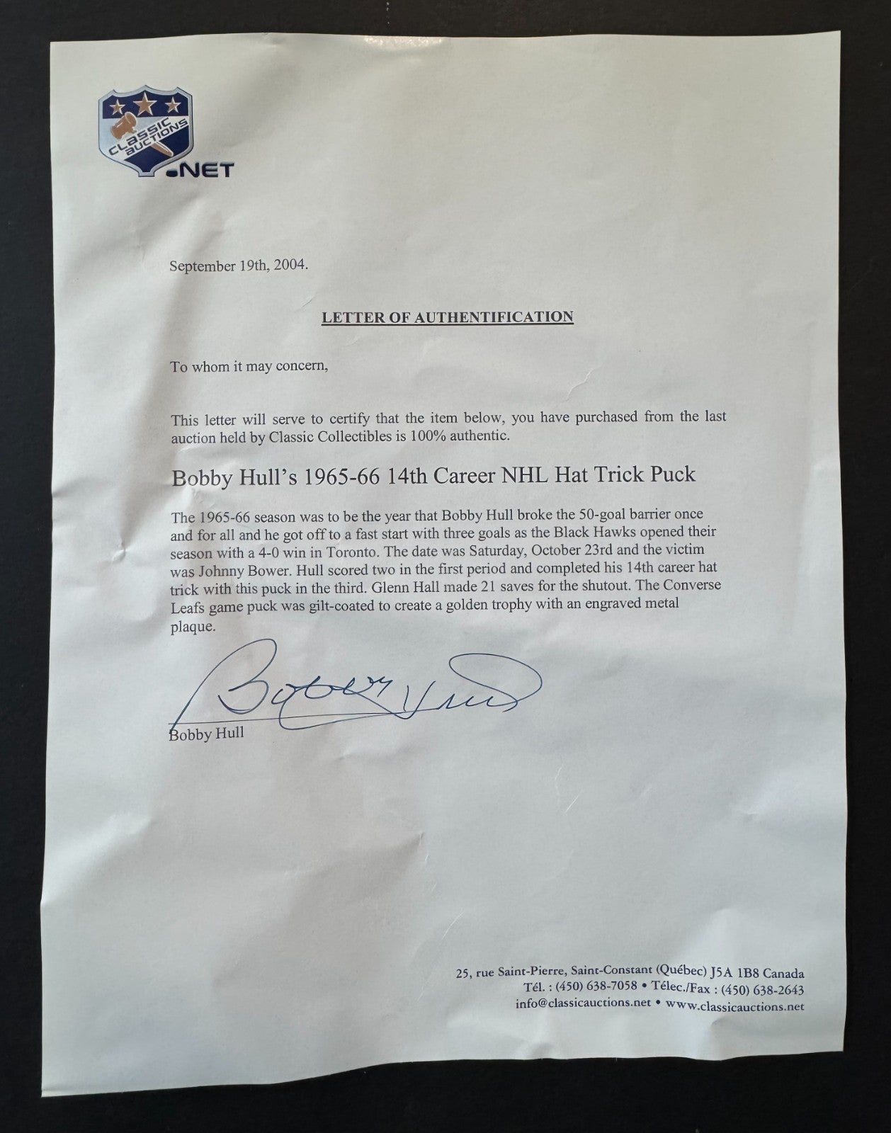 - LOA from Classic Auctions and signed by Bobby Hull