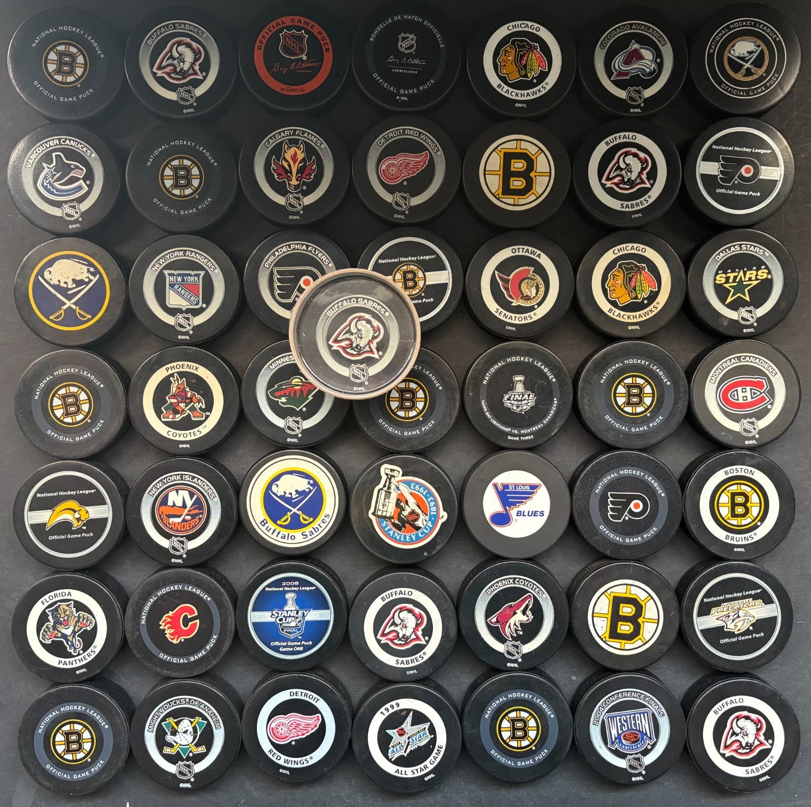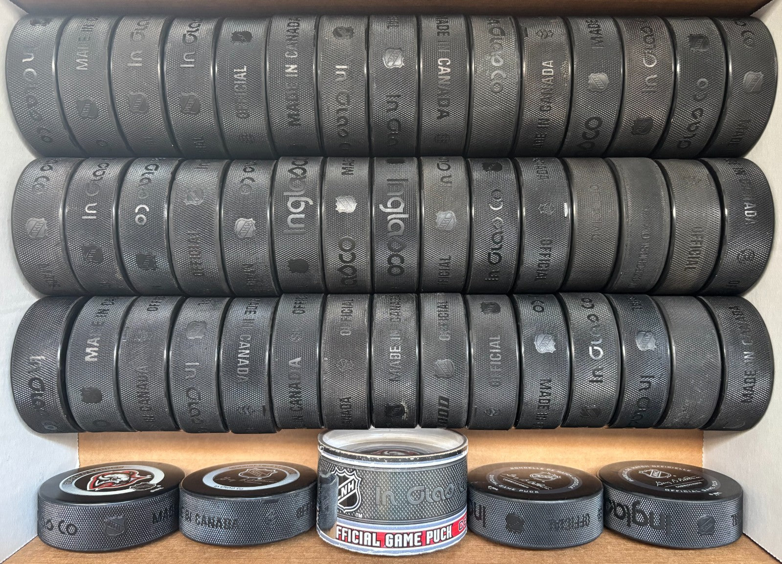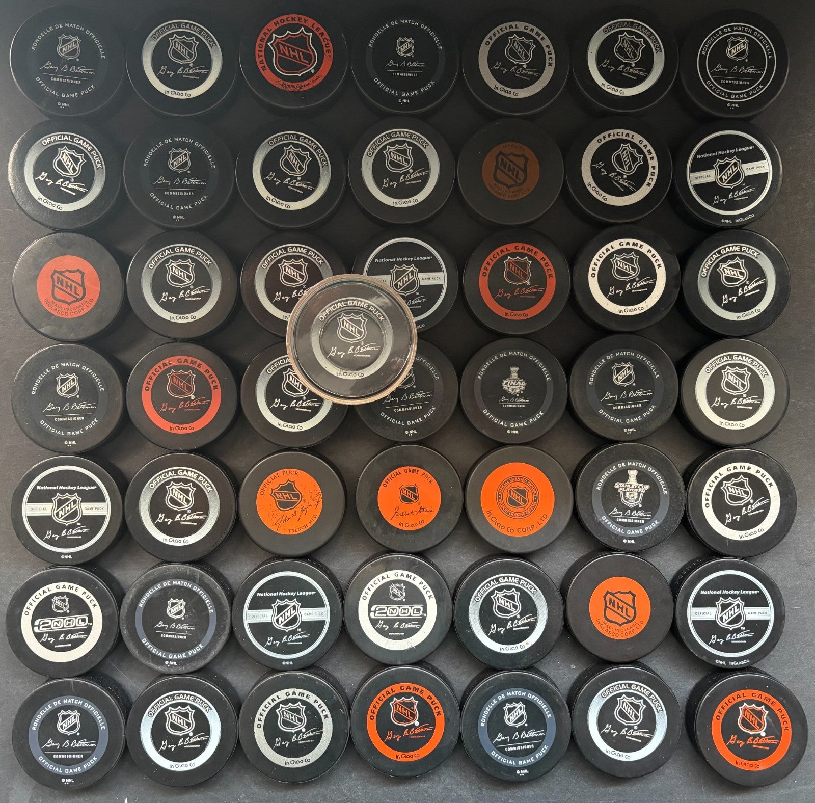 - Dealer lot of 50 official Inglasco NHL hockey game pucks, circa 1992-2020