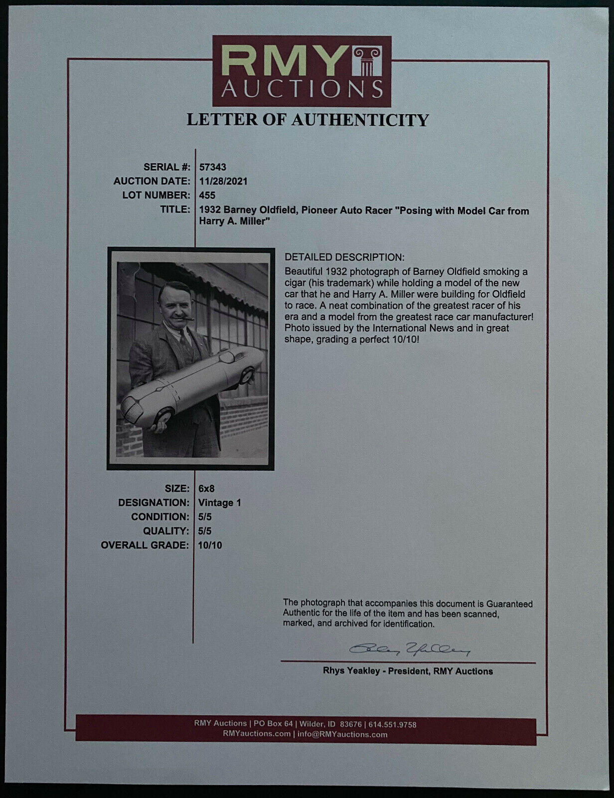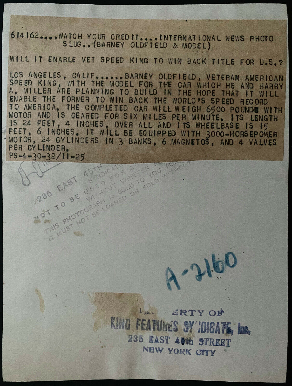 • November 25th, 1932 press photo of racing legend Barney Oldfield holding a model of a car built for Oldfield to attempt to win back the World's Land speed record