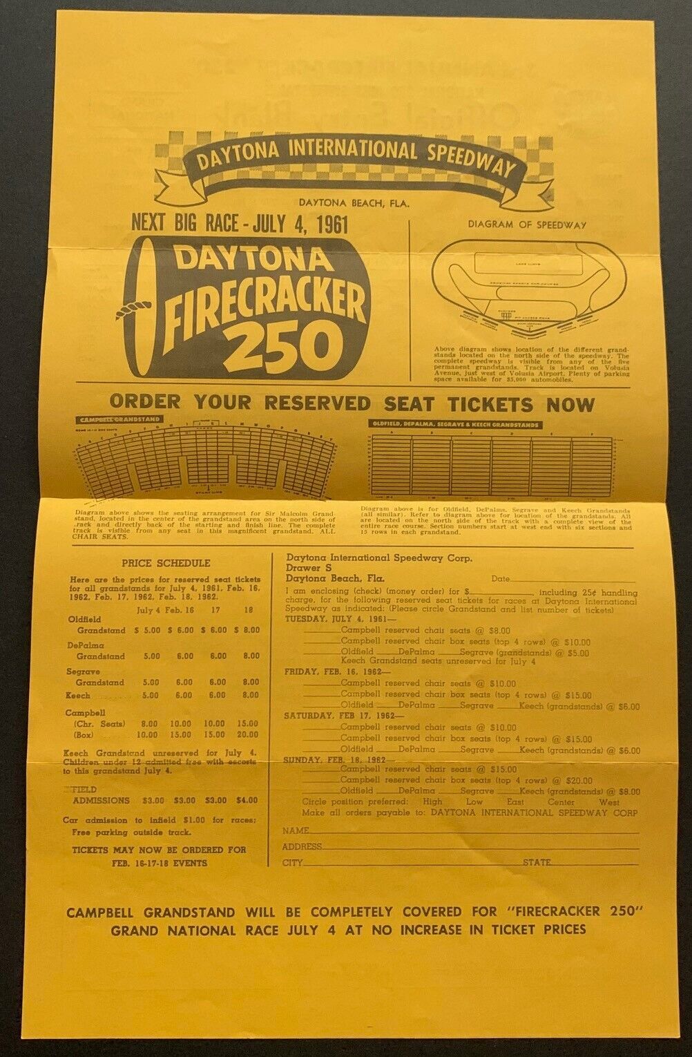 - Reverse side of form is an application for tickets to the 1961 Firecracker 250 and the 1962 Daytona 500
