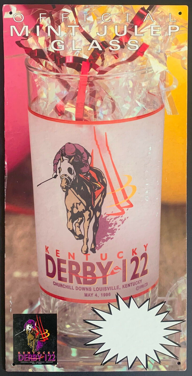 - May 4th, 1996 122nd Kentucky Derby heavy cardboard broadside advertising Official Mint Julep Glasses. Attributed to have been obtained directly from Churchill Downs
