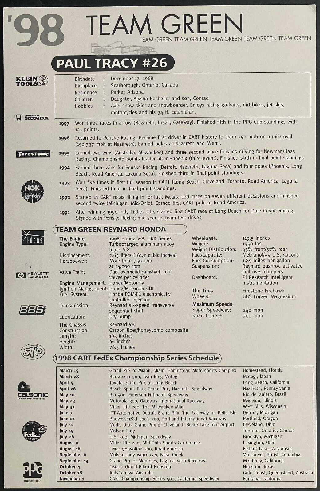 • 1998 Paul Tracy Cart Promo Personally Signed Autographed FedEx Championship