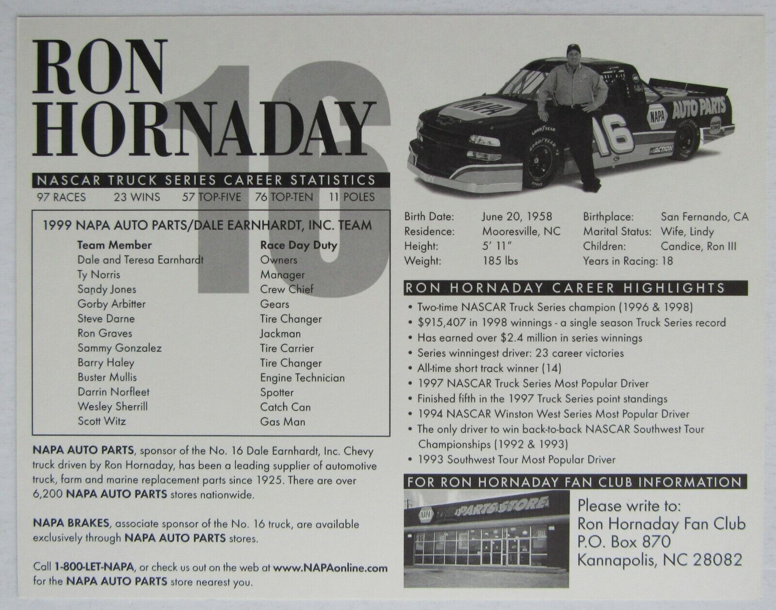 - 1998 Ron Hornaday Autographed Team Promo Photo - NASCAR Truck Series Champion