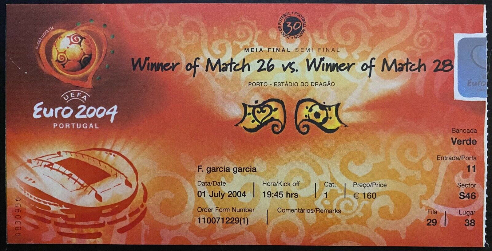 - July 1, 2004 used ticket stub for the semi-final of UEFA Euro 2004 between the Czech Republic and Greece in Portugal