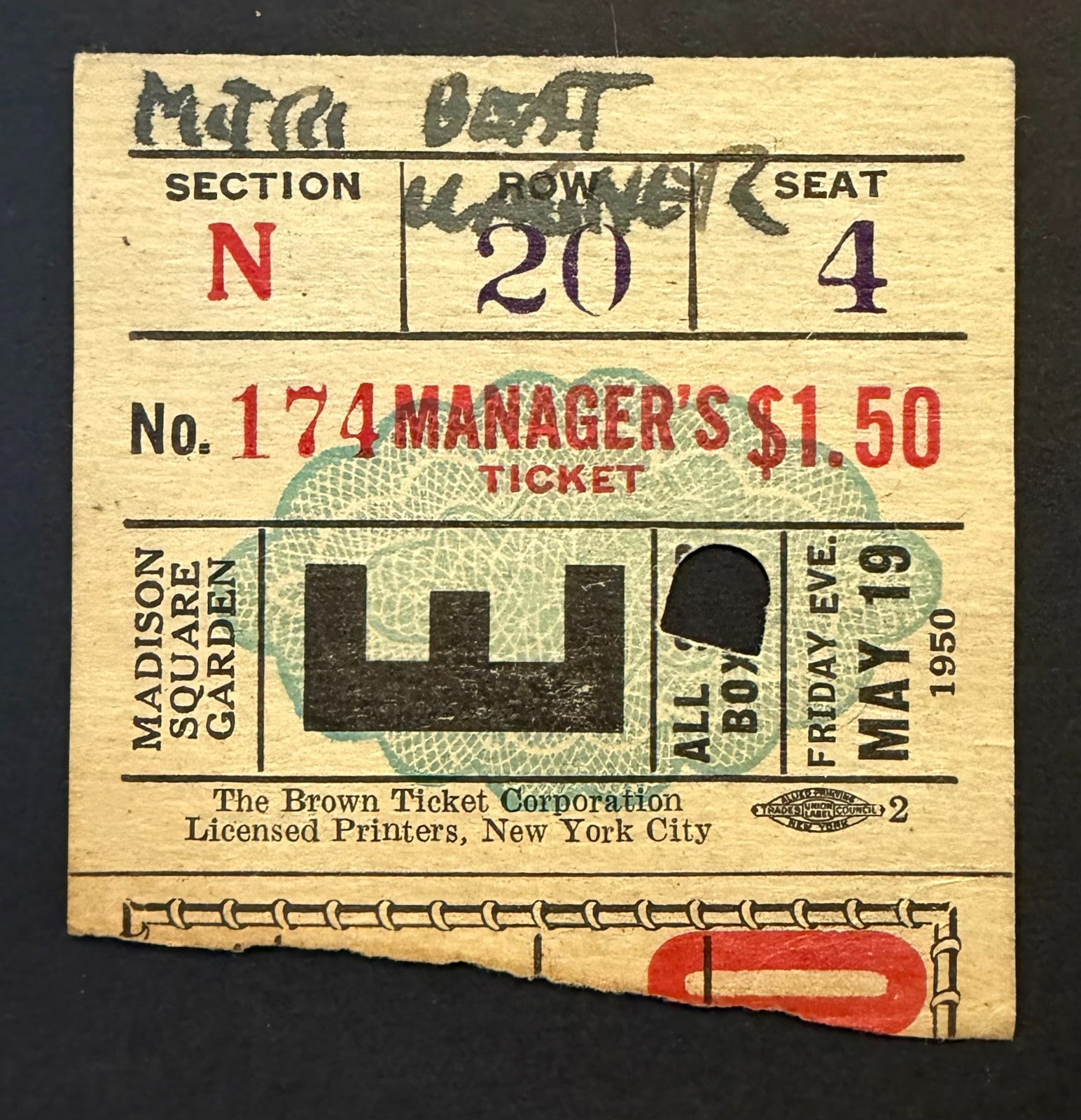 - 1950 Madison Square Garden Boxing Ticket Stub