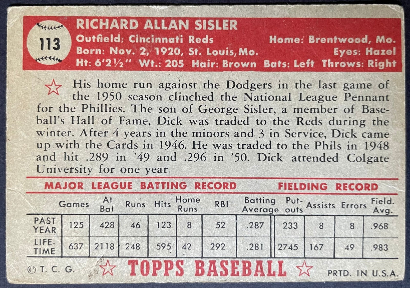- 1952 Topps Baseball Dick Sisler #113 Cincinnati Reds MLB Card Vintage