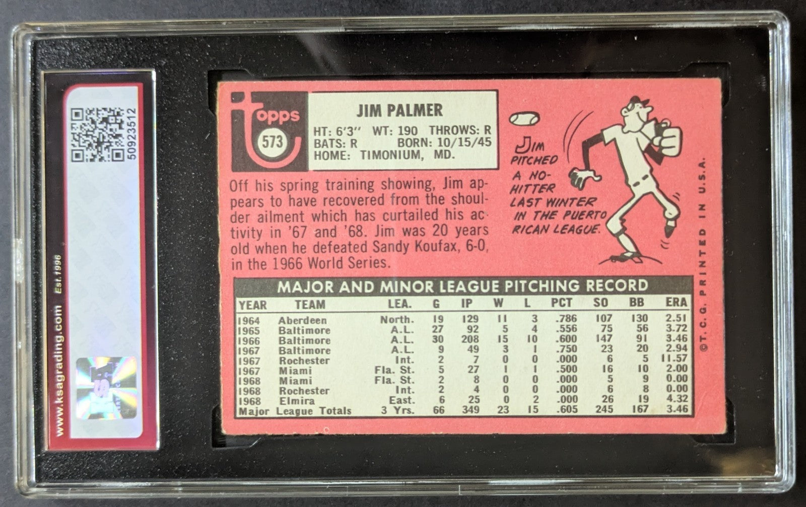 1969 O-Pee-Chee #573 Baltimore Orioles Jim Palmer Baseball Card KSA 4 VGE OPC