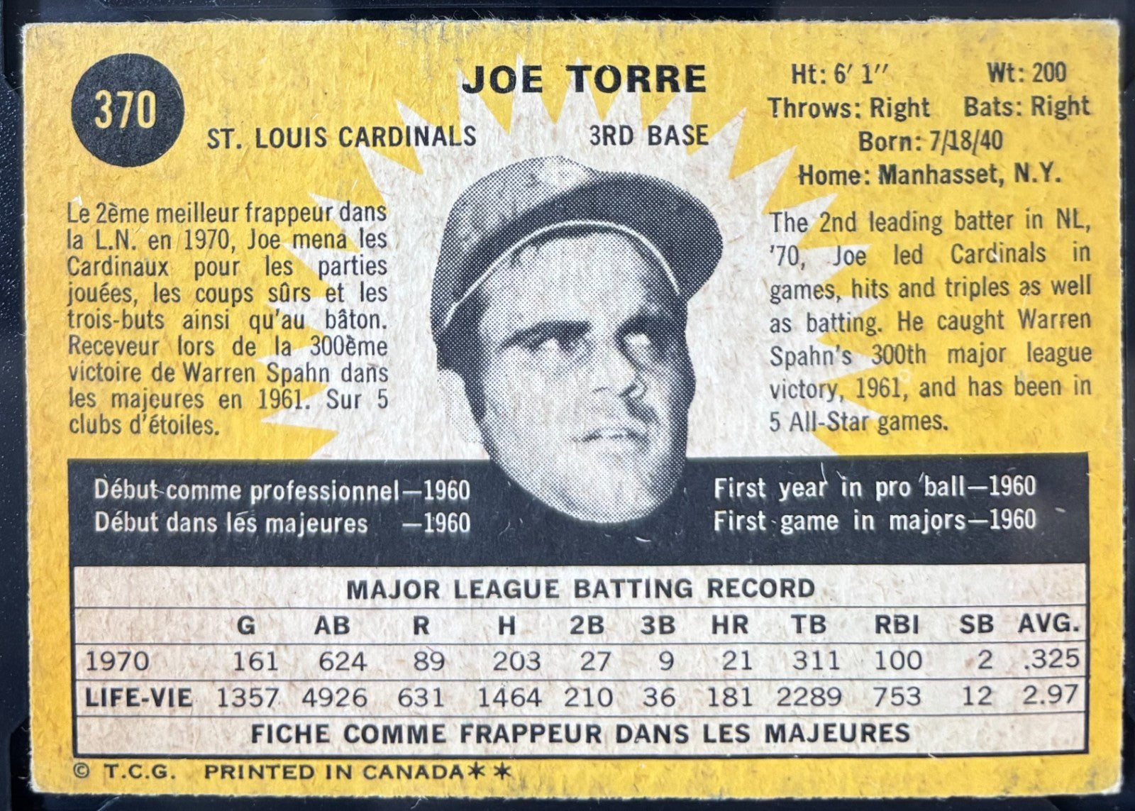 • 1971 O-PEE-CHEE (OPC) #370 Joe Torre vintage baseball card