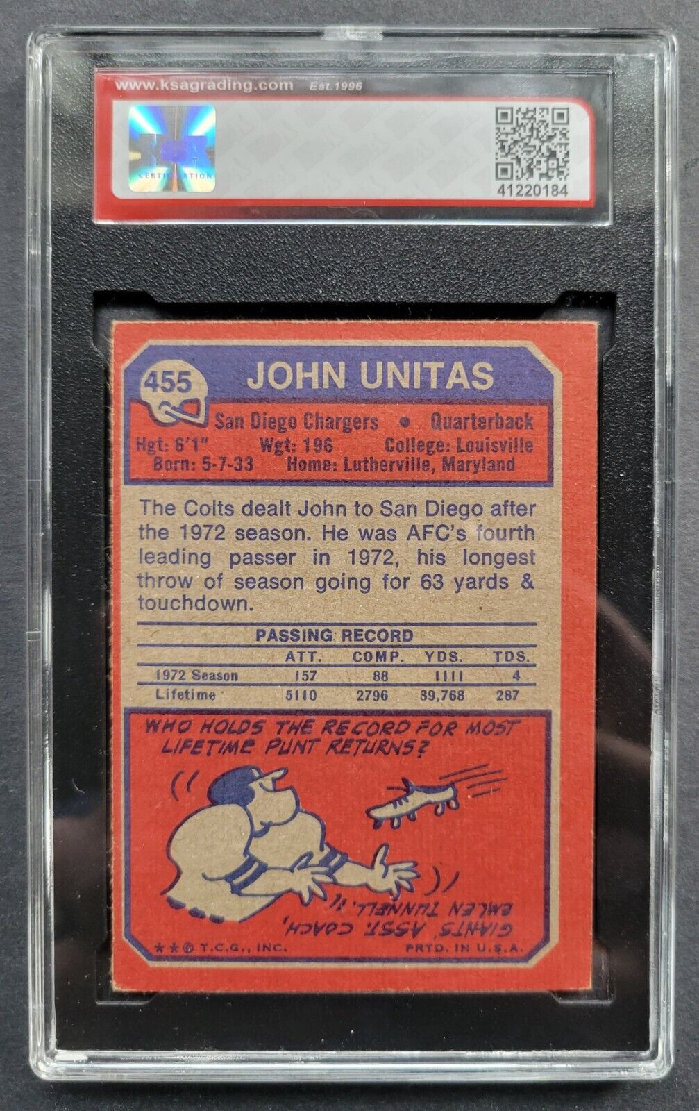 - 1973 Topps #455 John Unitas Card KSA 5 EX NFL Football Chargers QB Colts